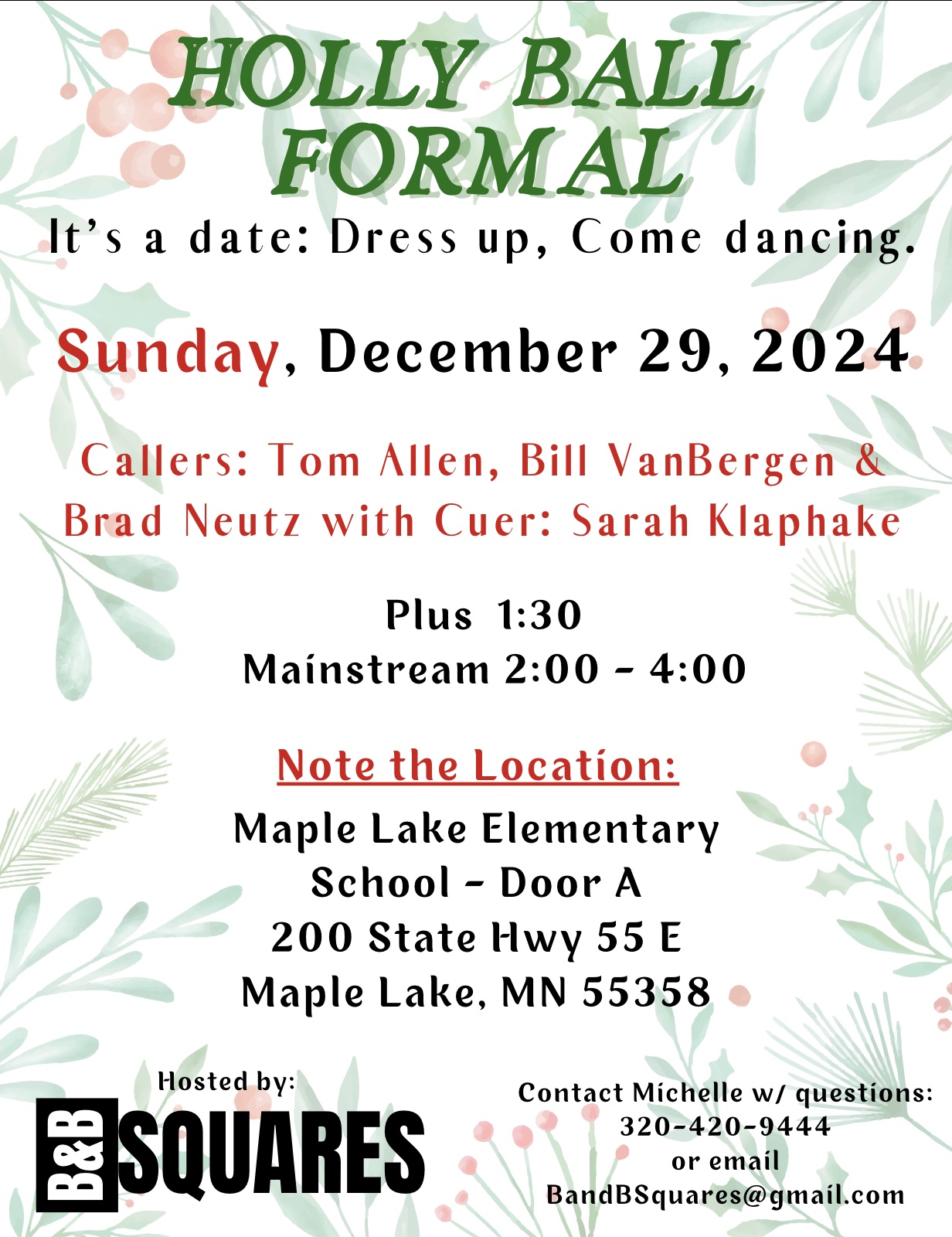 “Holly Ball Formal” Square Dance (Callers Bill VanBergen, Tom Allen and Brad Neutz, – “Plus” 1:30-2:00 pm; “Mainstream” 2:00-4:00 pm; Cuer Sarah Klaphake – “Rounds” between tips). Please bring a snack to share. B&B Squares Flyer