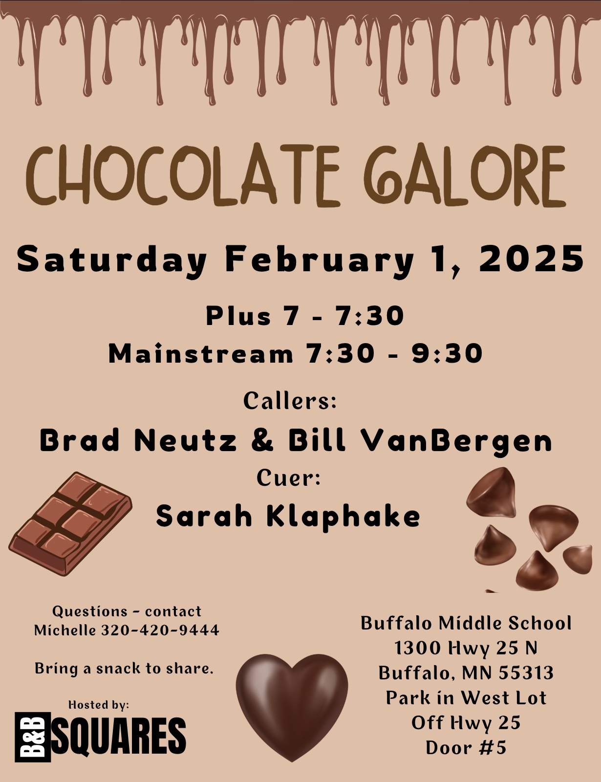 “Chocolate Galore” Square Dance (Callers Brad Neutz & Bill VanBergen – “Plus” 7:00-7:30 pm; “Mainstream” 7:30-9:30 pm; Cuer Sarah Klaphake – “Rounds” between tips). Please bring a snack to share. B&B Squares Flyer