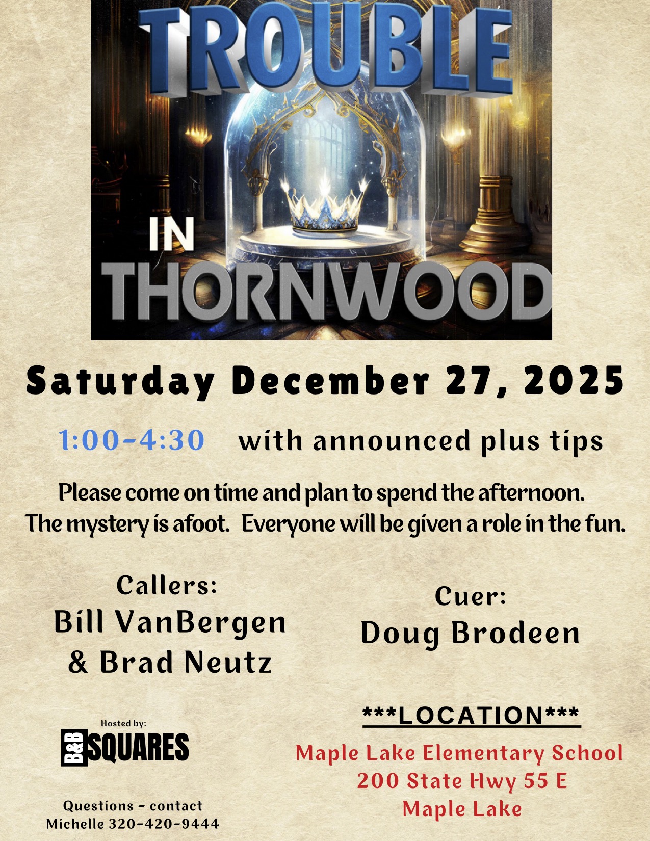 “Solve the Mystery in Thornwood” Square Dance (Callers Bill VanBergen & Brad Neutz – “Mainstream” 2:00-4:00 pm with announced “Plus” tips; Cuer Doug Brodeen – “Rounds” between tips). Please plan to attend the entire time, from 1:00-4:30 pm, so you can get your role and help solve the mystery. Please bring a snack to share. B&B Squares Flyer