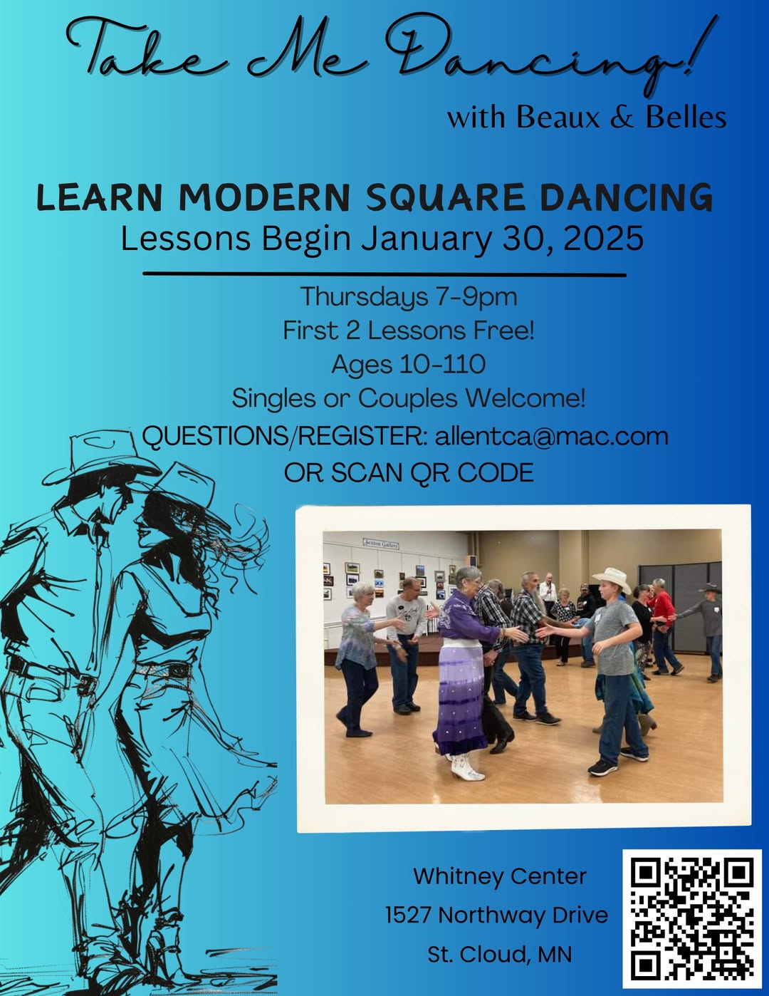 Square Dance Class (Caller/Instructor Tom Allen – “Learn to Square Dance” 7:00-9:00 pm). The first two lessons are free. Following that, they are $5 per person per evening. Beaux & Belles Flyer