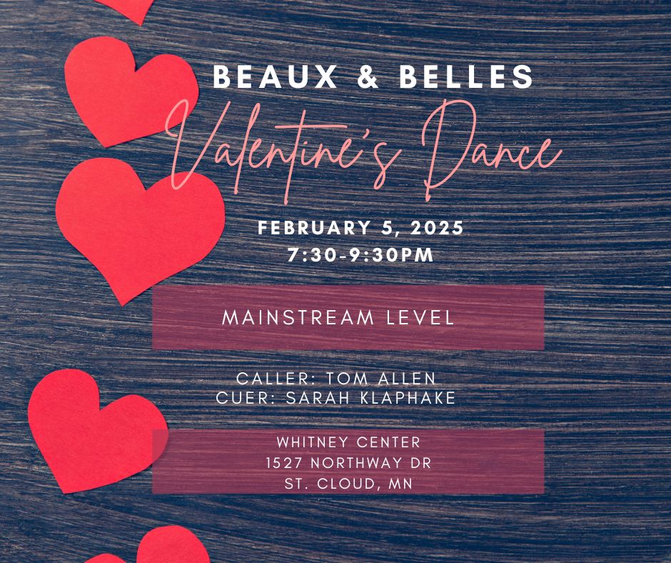 “Valentines” Square Dance (Caller Tom Allen – “Mainstream” 7:30-9:30 pm, “Plus” 9:30-10:00 pm; Cuer Sarah Klaphake – “Rounds” between tips), Potluck will be served during the dance. Beaux & Belles Flyer