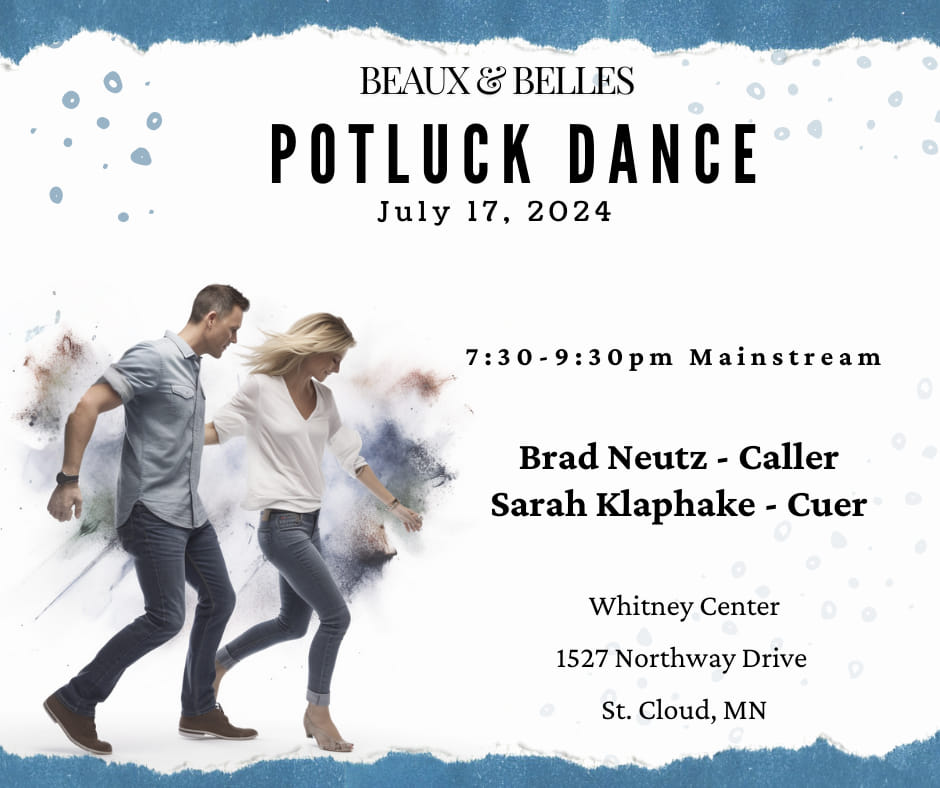 Square Dance (Caller Brad Neutz – “Mainstream” 7:30-9:30 pm, “Plus” 9:30-10:00 pm; Cuer Sarah Klaphake – “Rounds” between tips), potluck. Beaux & Belles Flyer