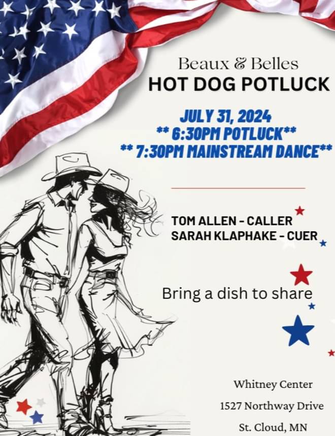 “Hot Dog Potluck” Square Dance (Caller Tom Allen – “Mainstream” 7:30-9:30 pm, “Plus” 9:30-10:00 pm; Cuer Sarah Klaphake – “Rounds” between tips), Grilled hotdogs along with potluck will be served at 6:30 pm. Beaux & Belles Flyer