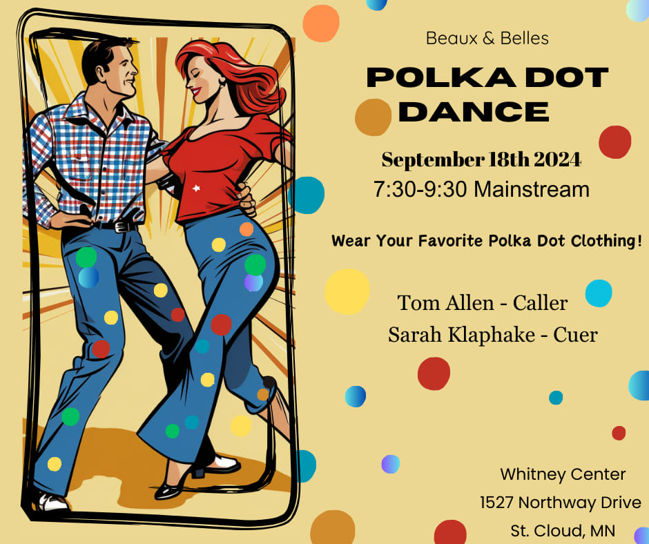 “Polka Dot Night” Square Dance (Caller Tom Allen – “Mainstream” 7:30-9:30 pm, “Plus” 9:30-10:00 pm; Cuer Sarah Klaphake – “Rounds” between tips), Potluck will be served during the dance.. Beaux & Belles Flyer