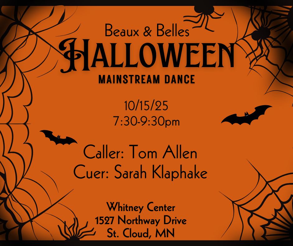 “Halloween” Square Dance (Caller Tom Allen – “Mainstream” 7:30-9:30 pm, “Plus” 9:30-10:00 pm; Cuer Sarah Klaphake – “Rounds” between tips), Potluck will be served during the dance. Beaux & Belles Flyer