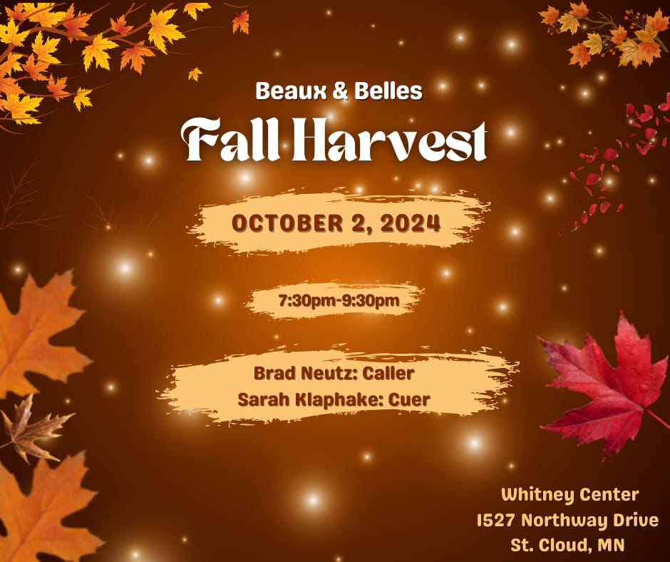 “Fall Harvest” Square Dance (Caller Brad Neutz – “Mainstream” 7:30-9:30 pm, “Plus” 9:30-10:00 pm; Cuer Sarah Klaphake – “Rounds” between tips), Potluck will be served during the dance.. Beaux & Belles Flyer
