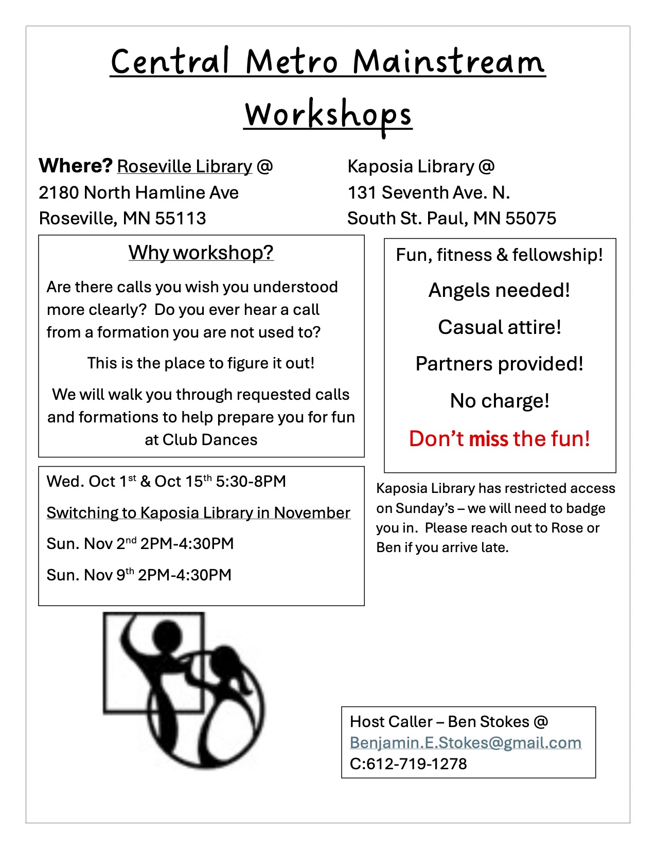 Central Metro Mainstream Workshop (Caller/Instructor Ben Stokes – “Mainstream” workshop 2:00-4:30 pm). Angels needed and appreciated. If you have particular calls you would like to practice, let him know and he’ll focus on them. A little lead-time helps in preparing materials. New day and location. Central Metro Mainstream Workshop Flyer