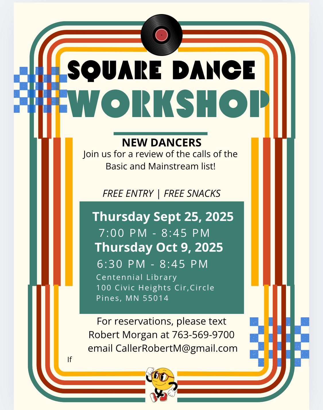 Circle Pines Mainstream Workshop (Caller/Instructor Robert Morgan – “Mainstream” workshop 6:30-8:45 pm). Free. Circle Pines Mainstream Workshop Flyer