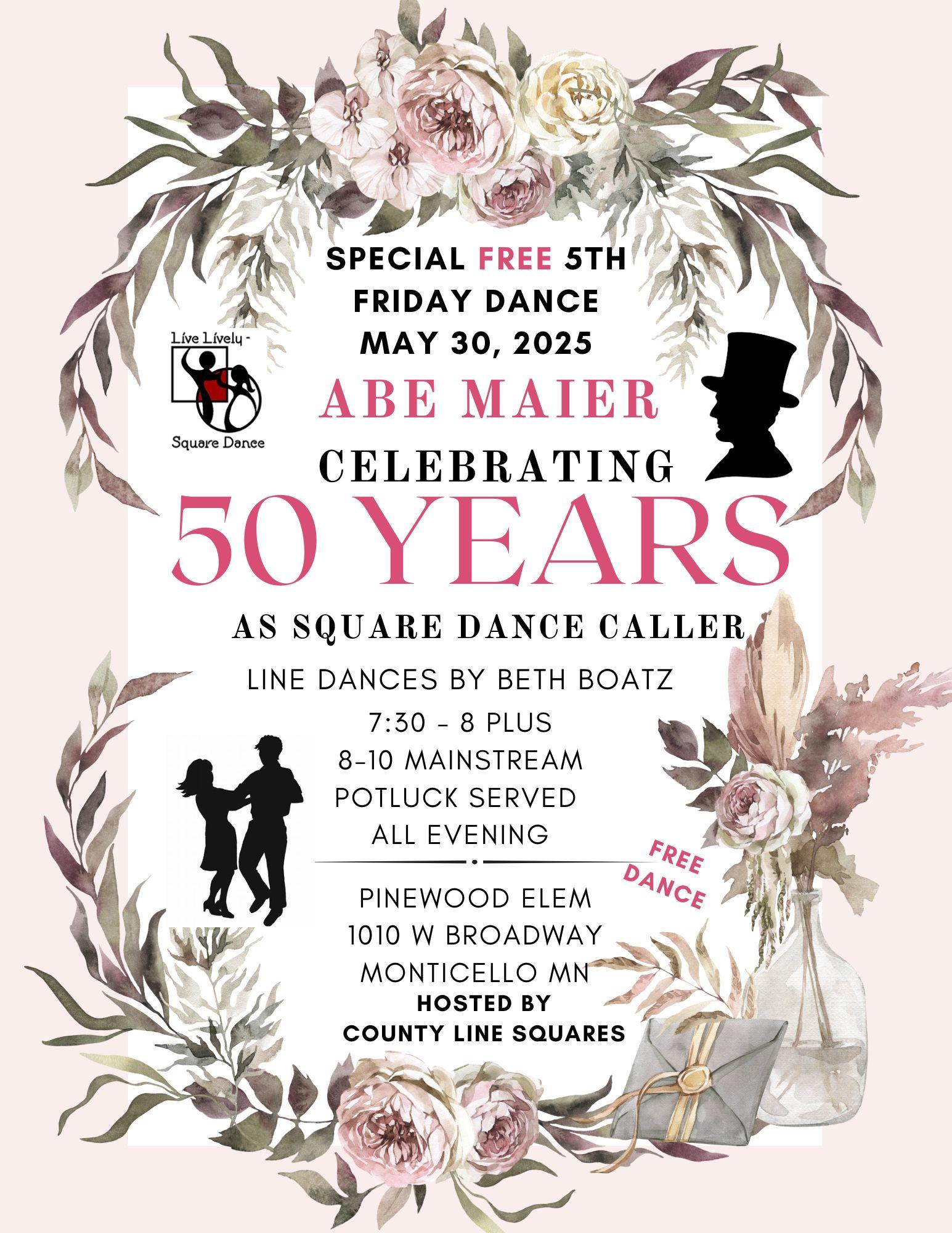 “50 Year Anniversary as Square Dance Caller” Square Dance (Caller Abe Maier – “Plus” 7:30-8:00 pm, “Mainstream” 8:00-10:00 pm; Cuer Beth Boatz – Line Dancing between tips), potluck during dance. FREE admission. County Line Squares Flyer