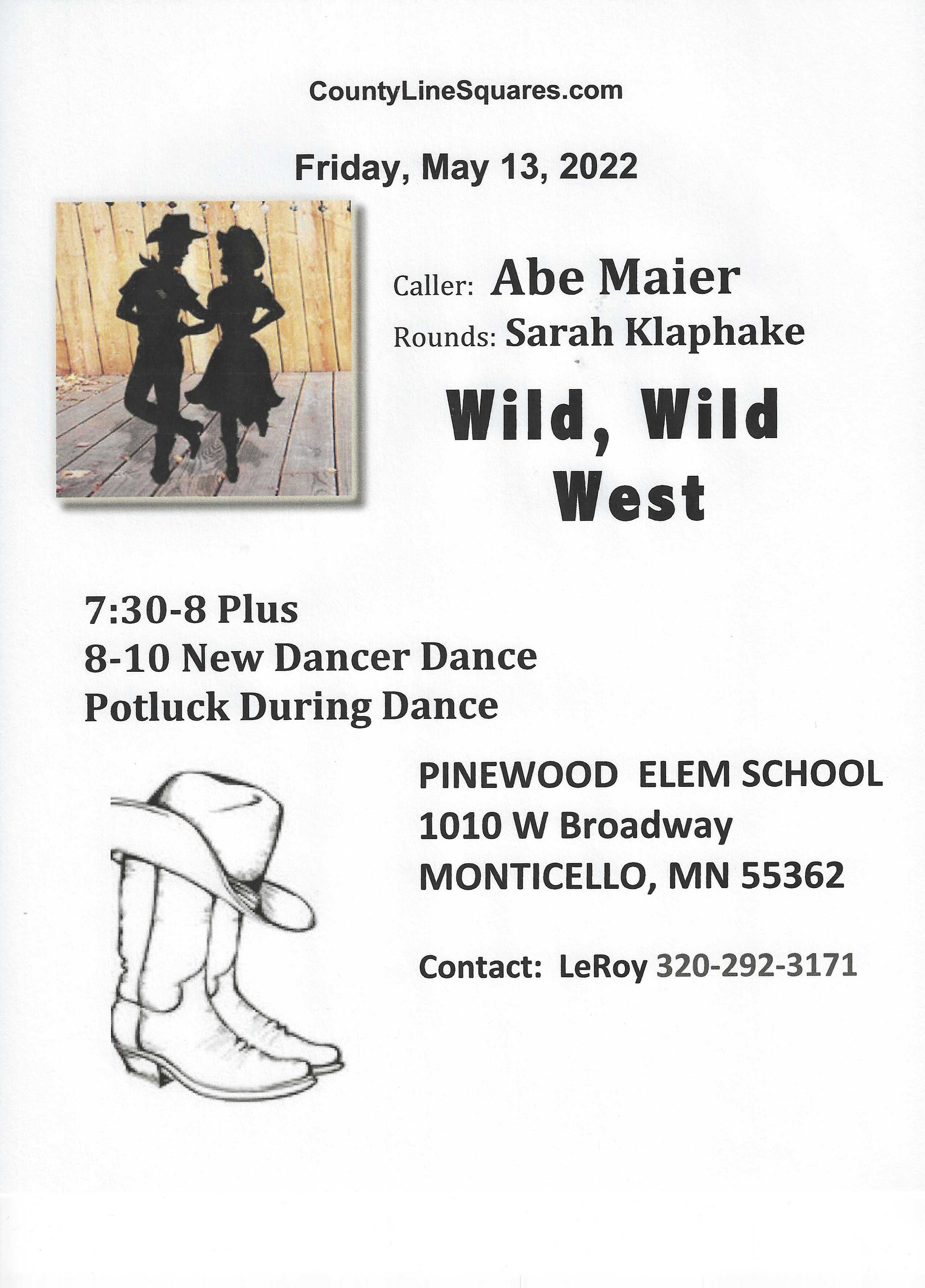“Wild, Wild, West” Square Dance (Caller Abe Maier – “Plus” 7:30-8:00 pm, “New Dancer/Mainstream” 8:00-10:00 pm; Cuer Sarah Klaphake – “Rounds” between tips), potluck during dance.  County Line Squares Flier