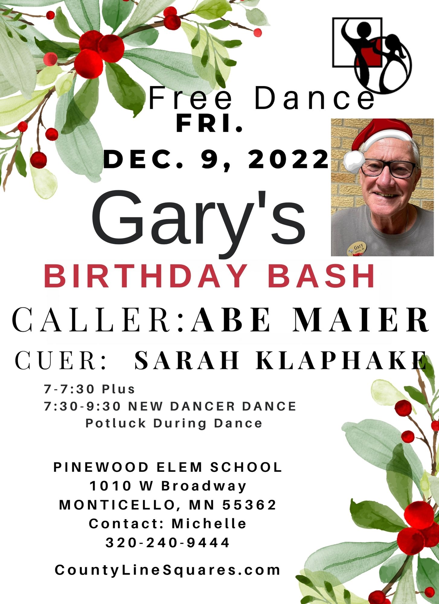 “Gary’s Birthday Bash” Square Dance (Caller Abe Maier – “Plus” 7:00-7:30 pm, “Mainstream” 7:30-9:30 pm; Cuer Sarah Klaphake – “Rounds” between tips), potluck during dance. Free dance. County Line Squares Flier