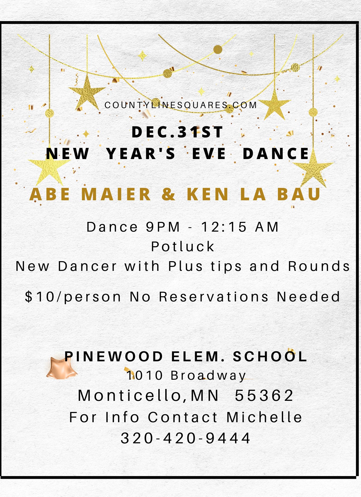 “New Year’s Eve” Square Dance (Caller Abe Maier – “New Dancer/Mainstream” 9:00 pm – 12:15 am, with a “Plus” tip; Cuer Ken LaBau – “Rounds” between tips), potluck during dance. County Line Squares Flier