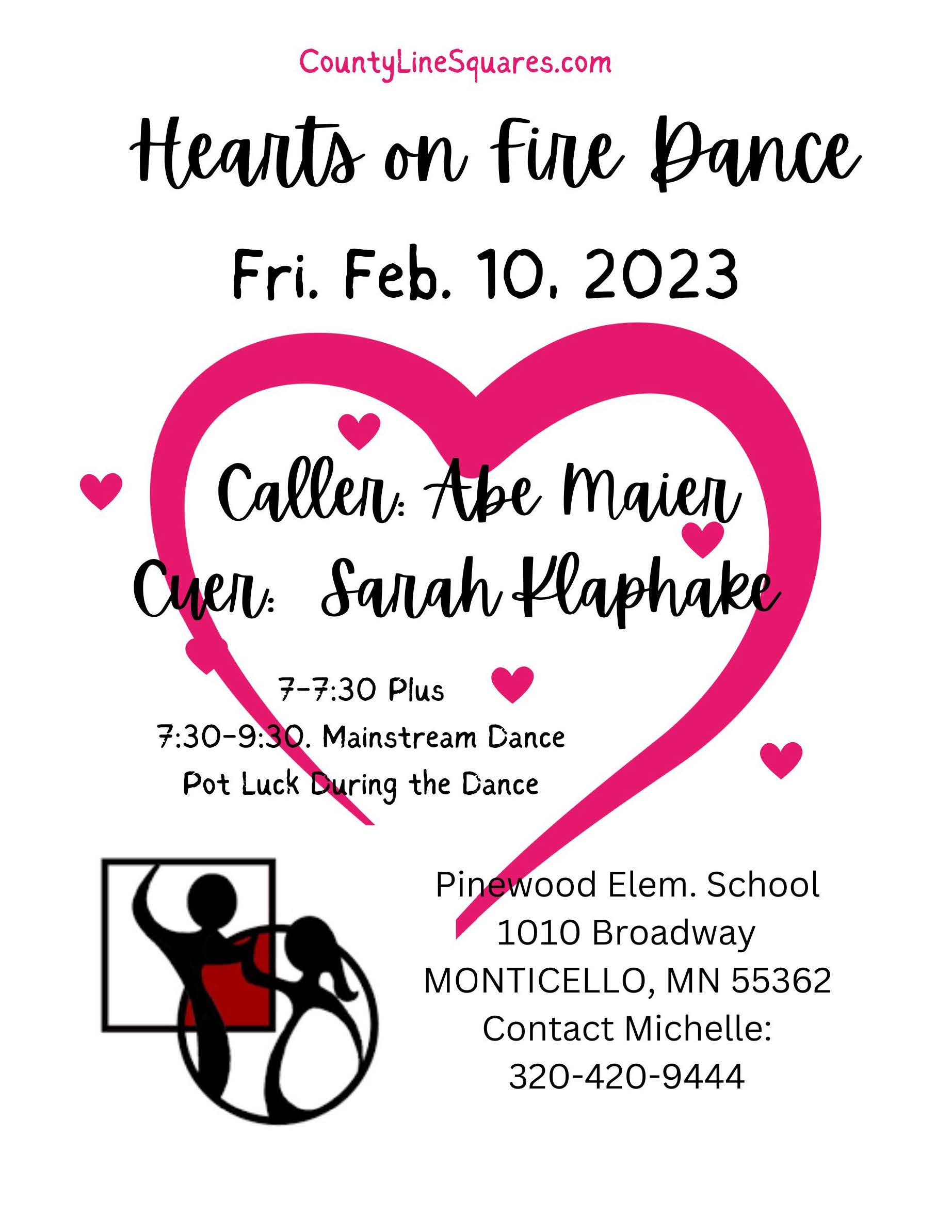 “Hearts on Fire” Square Dance (Caller Abe Maier – “Plus” 7:00-7:30 pm, “Mainstream” 7:30-9:30 pm; Cuer Sarah Klaphake – “Rounds” between tips), potluck during dance. County Line Squares Flier