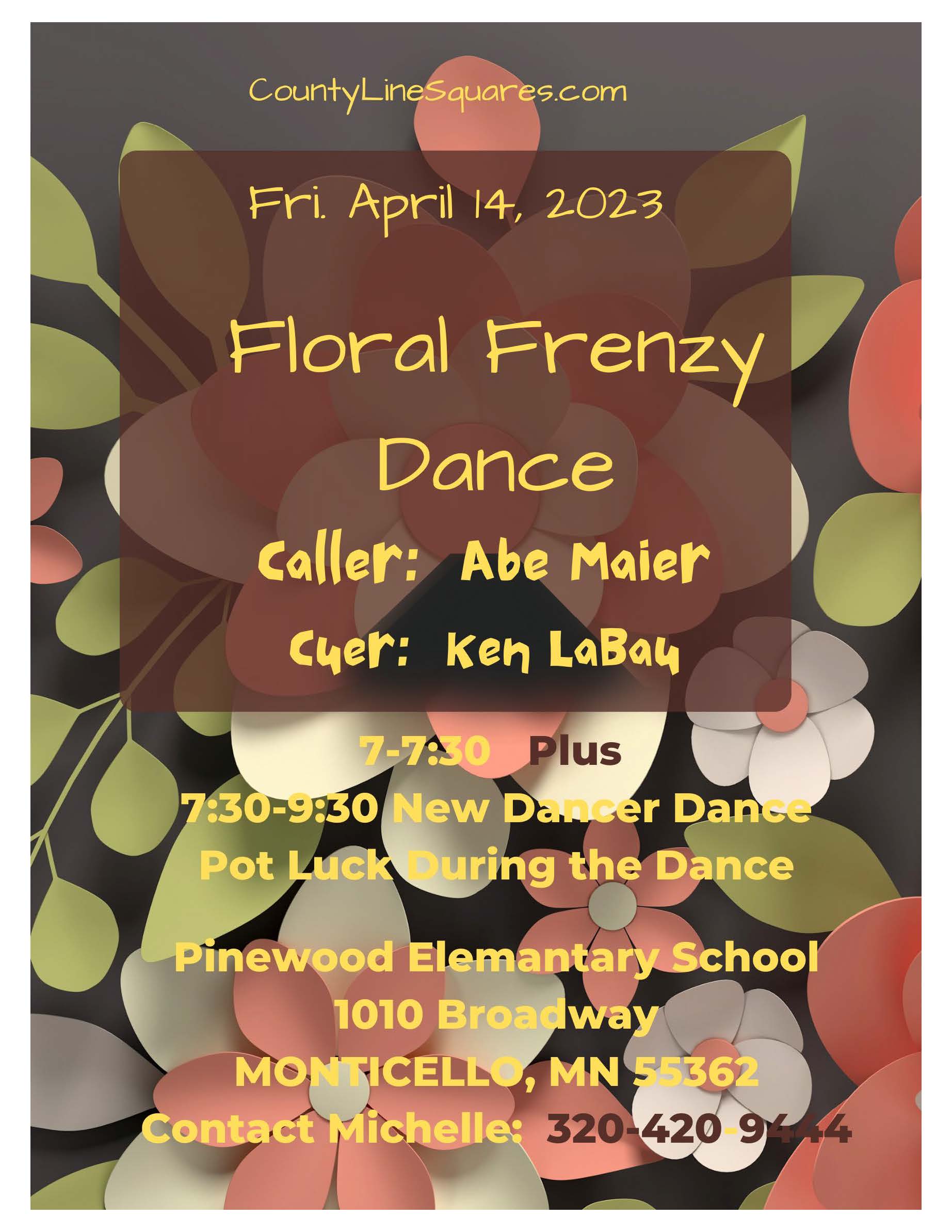 “Floral Frenzy” Square Dance (Caller Abe Maier – “Plus” 7:00-7:30 pm, “New Dancer” 7:30-9:30 pm; Cuer Ken LaBau – “Rounds” between tips), potluck during dance. County Line Squares Flier