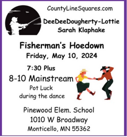 “Fisherman’s Hoedown” Square Dance (Caller Dee Dee Dougherty-Lottie – “Plus” 7:30-8:00 pm, “Mainstream” 8:00-10:00 pm; Cuer Sarah Klaphake – “Rounds” between tips), potluck during dance. County Line Squares Flyer