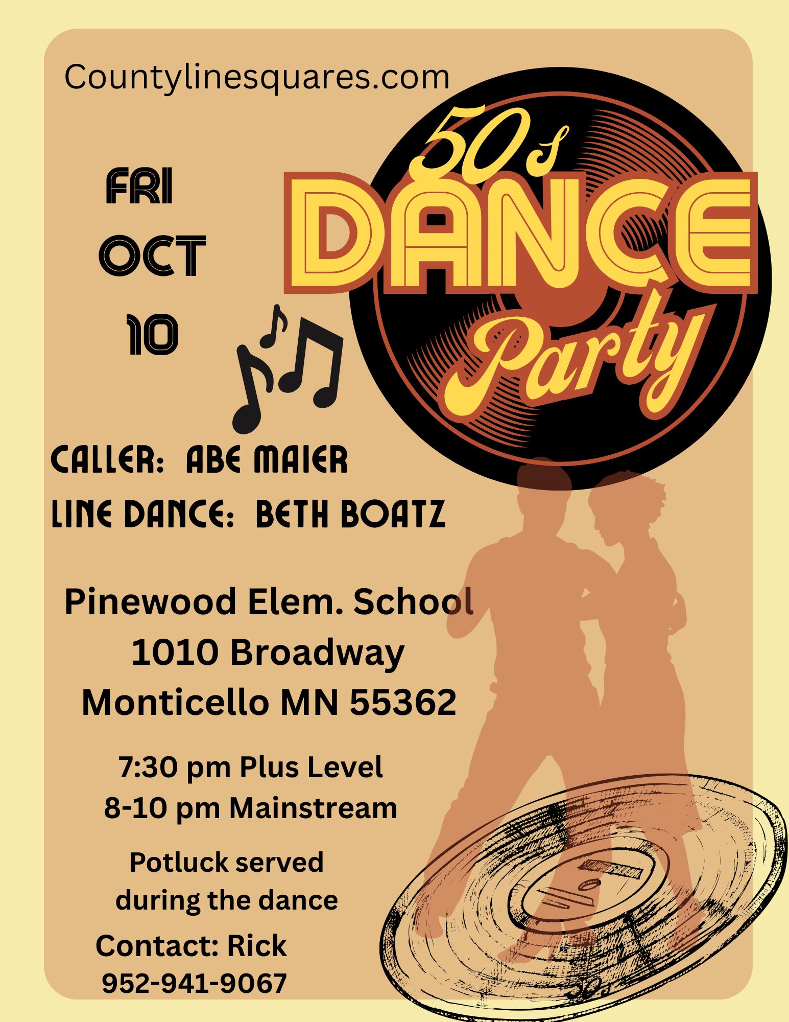 “’50s Dance Party” Square Dance (Caller Abe Maier – “Plus” 7:30-8:00 pm, “Mainstream” 8:00-10:00 pm; Cuer Beth Boatz – Line Dancing between tips), potluck during dance. County Line Squares Flyer