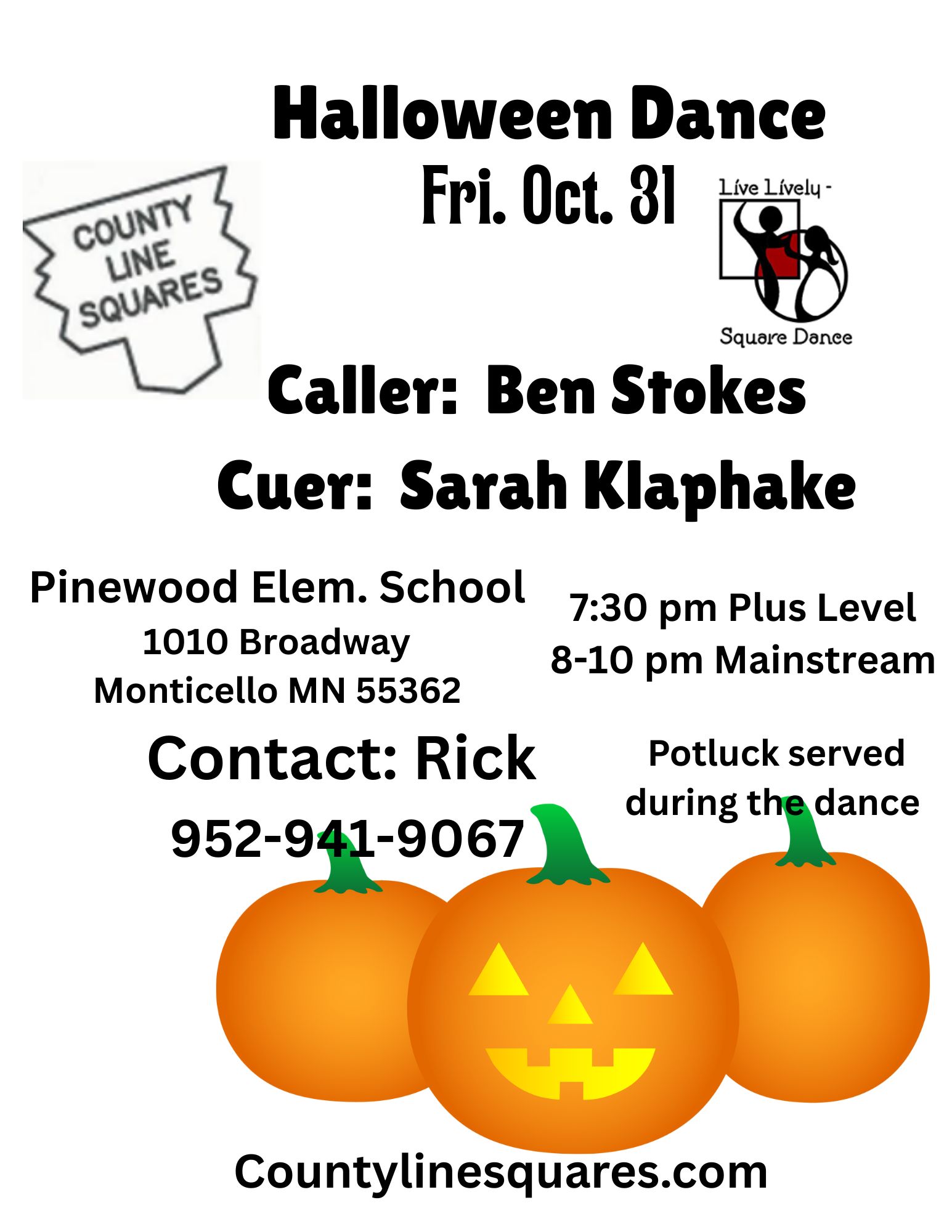 “Halloween” Square Dance (Caller Ben Stokes – “Plus” 7:30-8:00 pm, “Mainstream” 8:00-10:00 pm; Cuer Sarah Klaphake – Round Dancing between tips), potluck during dance. County Line Squares Flyer