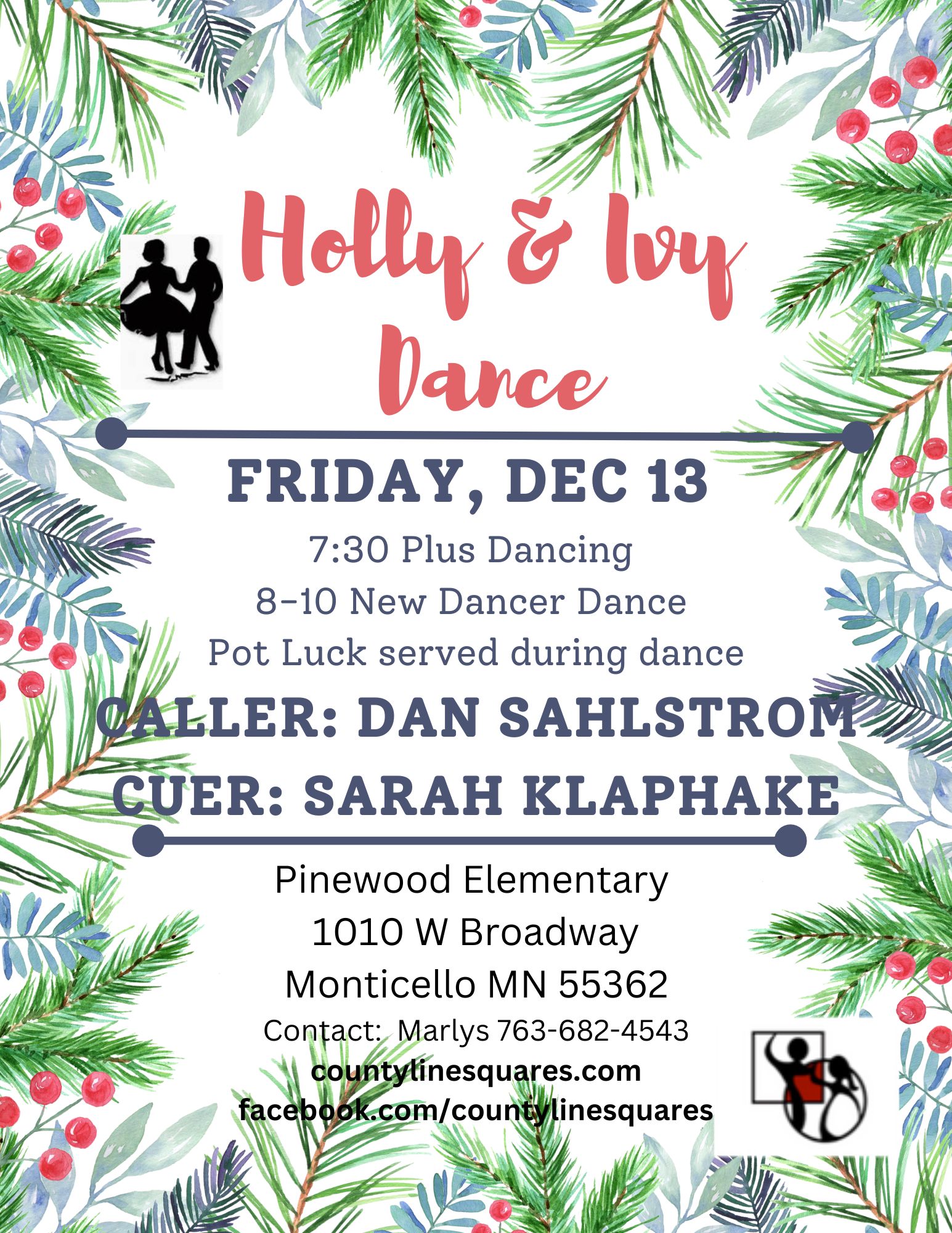 “Holly & Ivy” New-Dancer Square Dance (Caller Dan Sahlstrom – “Plus” 7:30-8:00 pm, “New-Dancer Mainstream” 8:00-10:00 pm; Cuer Sarah Klaphake – “Rounds” between tips), potluck during dance. County Line Squares Flyer