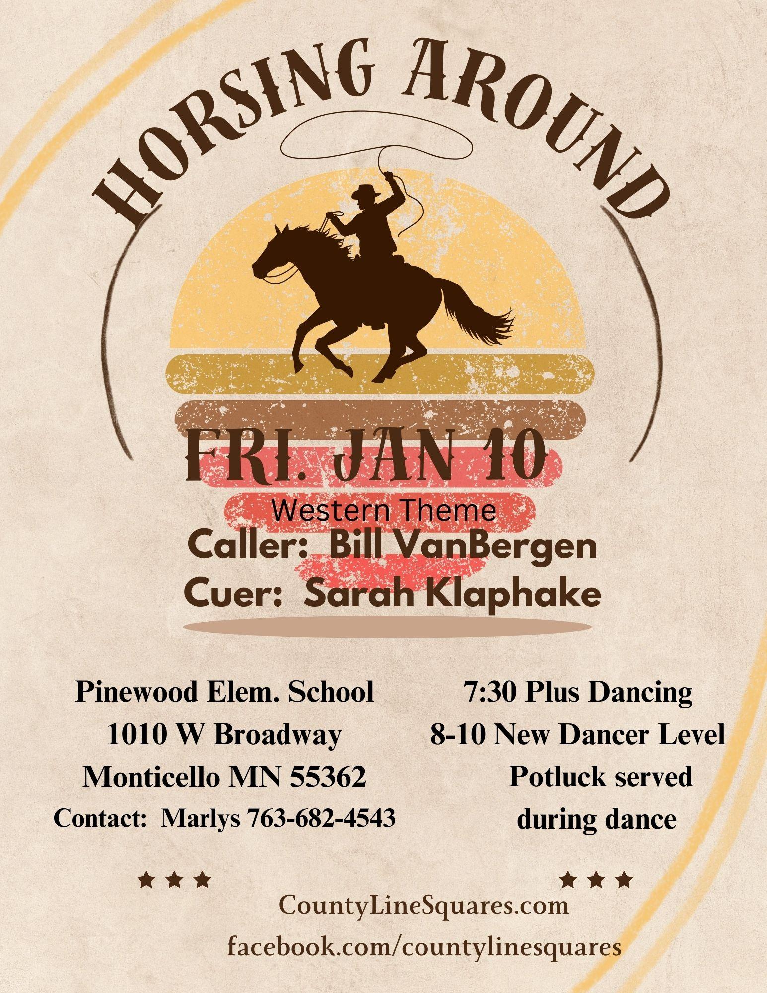 “Horsing Around” New-Dancer Square Dance (Caller Bill VanBergen – “Plus” 7:30-8:00 pm, “New-Dancer Mainstream” 8:00-10:00 pm; Cuer Sarah Klaphake – “Rounds” between tips), potluck during dance. Western theme. County Line Squares Flyer