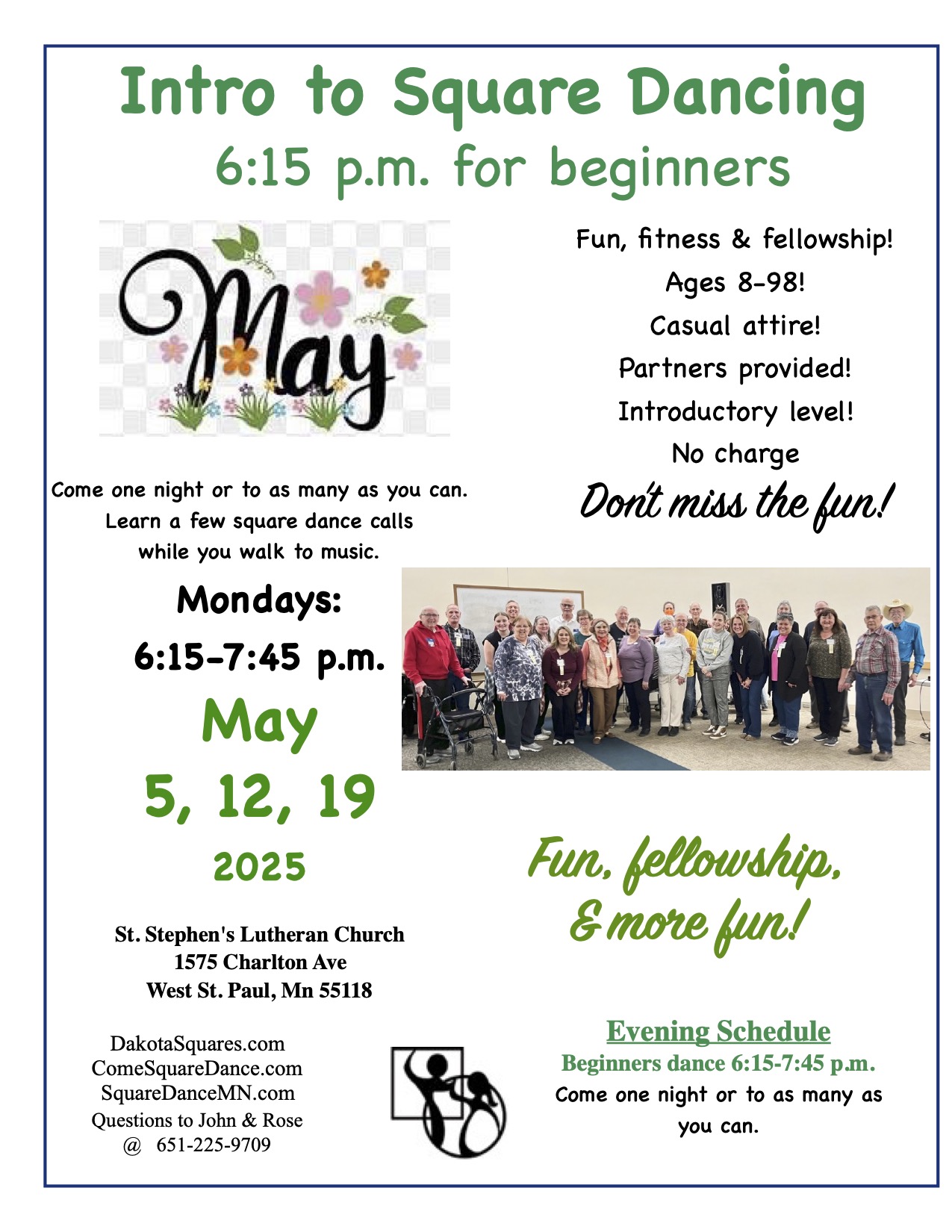 Intro to Square Dancing (Caller/Instructor Larry Fruetel “Beginner Square Dancing” 6:15-7:45 pm). Free! Casual attire. Dakota Squares Flyer