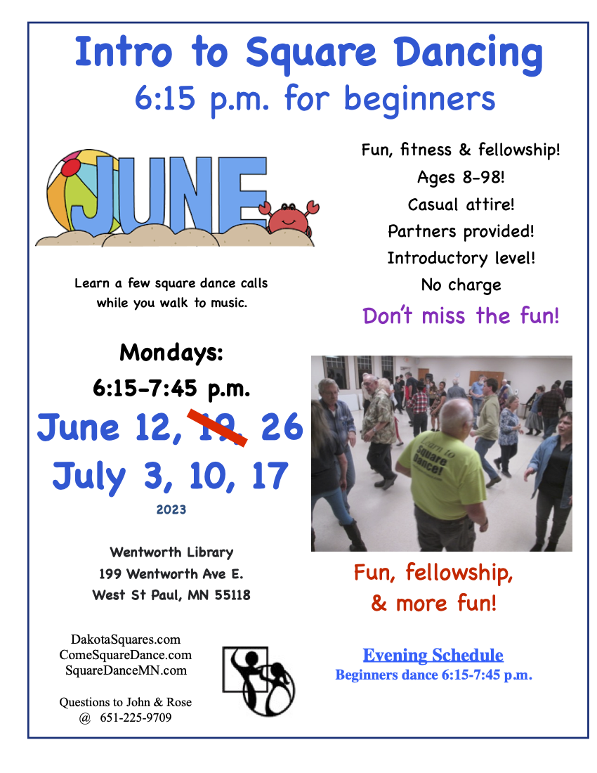 Intro to Square Dancing (“Beginner Square Dancing” 6:15-7:45 pm).