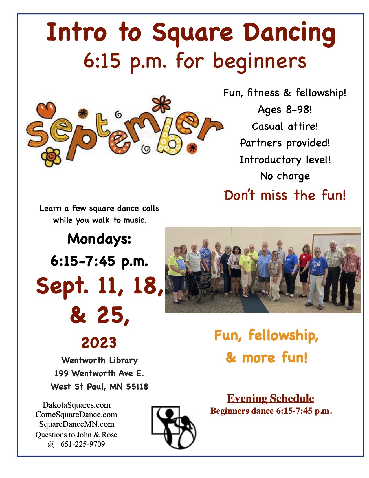 Intro to Square Dancing (“Beginner Square Dancing” 6:15-7:45 pm).  Dakota Squares Flier