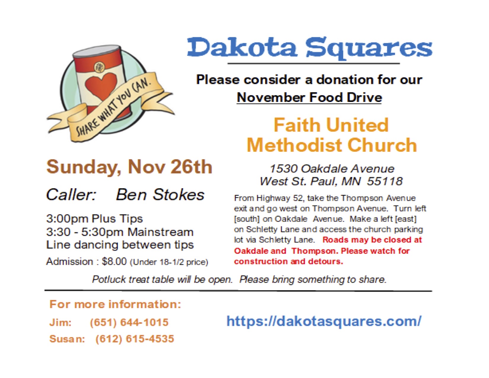 “Grateful” Square Dance (Caller Ben Stokes – “Plus” 3:00-3:30 pm, “Mainstream” 3:30-5:30 pm), potluck treat table of pre-packaged finger food. Line dancing with Beth Boatz between tips. Dakota Squares Flier