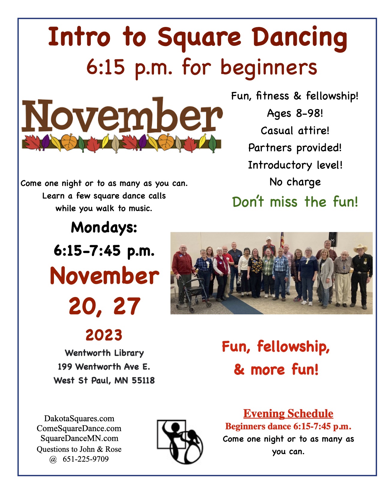 Intro to Square Dancing (“Beginner Square Dancing” 6:15-7:45 pm). Dakota Squares Flier