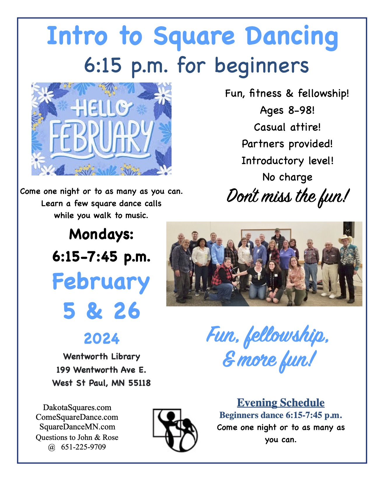 Intro to Square Dancing (“Beginner Square Dancing” 6:15-7:45 pm). Dakota Squares Flyer