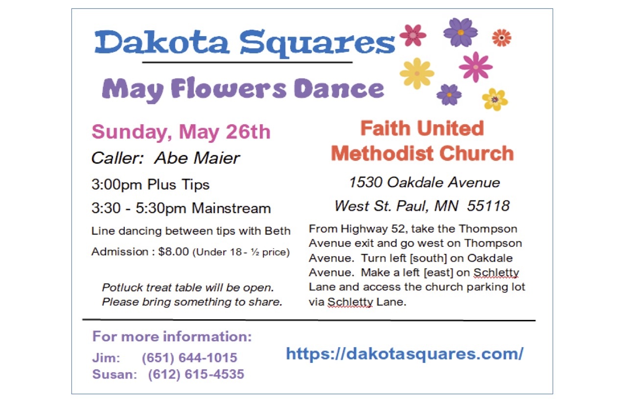 “May Flowers” Square Dance (Caller Abe Meier – “Plus” 3:00-3:30 pm, “Mainstream” 3:30-5:30 pm; Cuer Beth Boatz – “Line dancing” between tips), potluck treat table of pre-packaged finger food. Dakota Squares Flyer