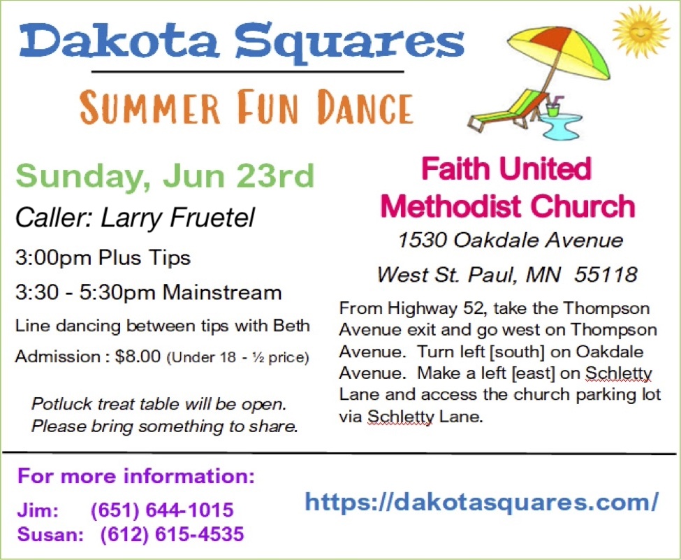 “Summer Fun!” Square Dance (Caller Larry Fruetel – “Plus” 3:00-3:30 pm, “Mainstream” 3:30-5:30 pm; Cuer Beth Boatz – “Line dancing” between tips), potluck treat table of pre-packaged finger food. Dakota Squares Flyer