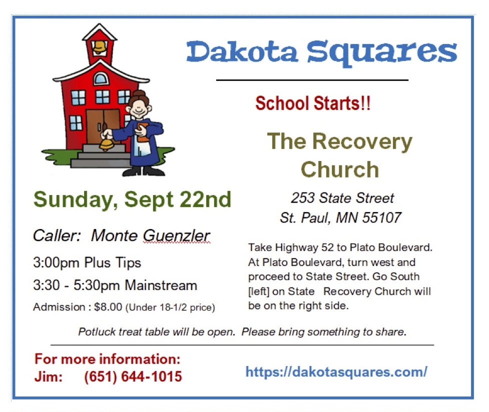 “School Starts!” Square Dance (Caller Monte Guenzler – “Plus” 3:00-3:30 pm, “Mainstream” 3:30-5:30 pm; Cuer Beth Boatz – “Line dancing” between tips), potluck treat table of pre-packaged finger food. Dakota Squares Flyer