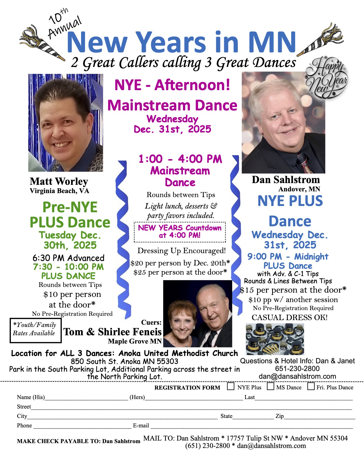“10th Annual New Year’s Eve” Square Dance (Callers Dan Sahlstrom and Matt Worley – “Plus” 9:00 pm – 12:00 am, with “Advanced” and “Challenge 1” tips; Cuers Tom and Shirlee Feneis – “Rounds” between tips). Dan’se P.A.C. Flyer