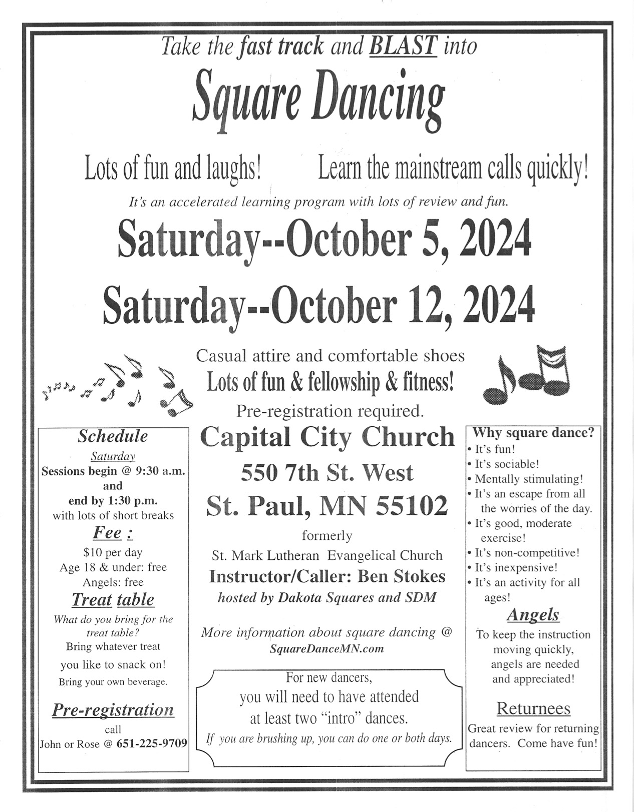 East Metro Mainstream Blast (Caller Ben Stokes – “Mainstream” instruction will include all calls 9:30 am-1:30 pm). Dakota Squares is sponsoring a two-part, mainstream BLAST dance Saturdays, October 5 and 12, 2024. Two ABC sessions are a prerequisite for new dancers; casual attire; potluck treat table. East Metro Blast Flyer