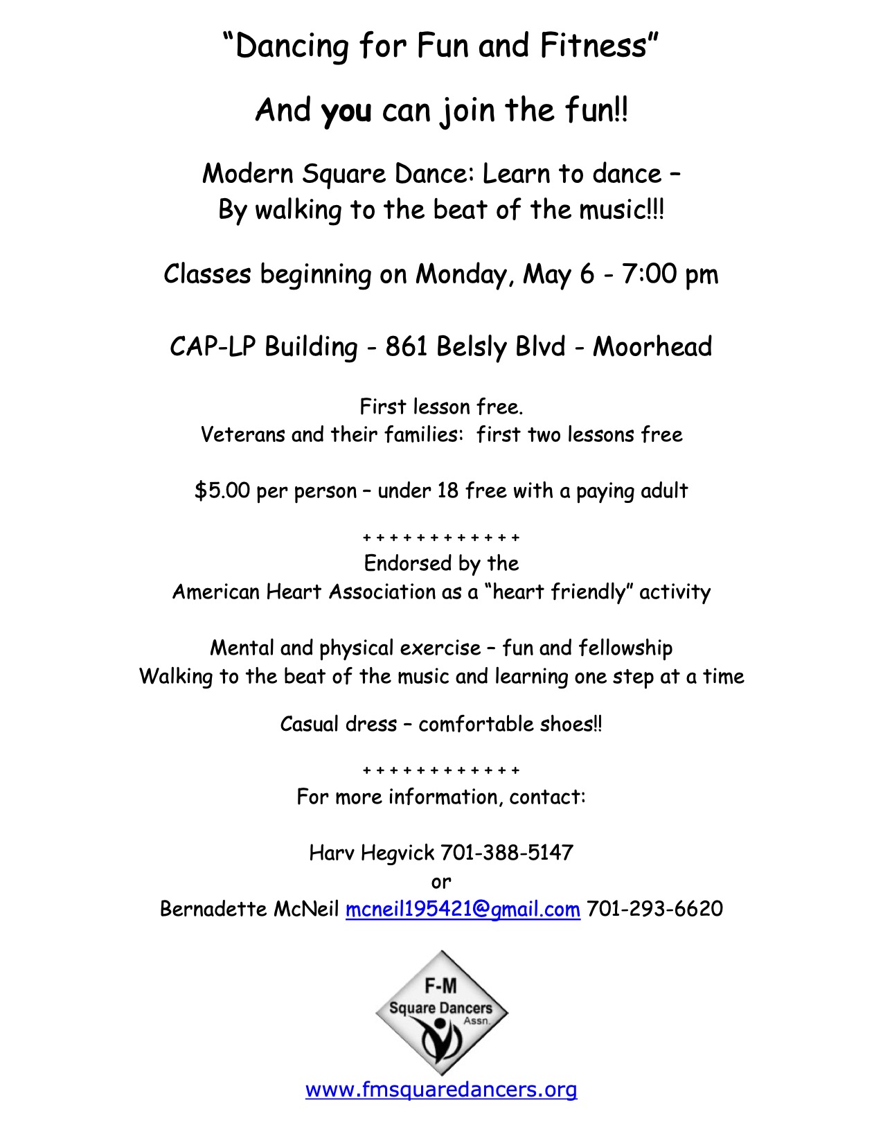 Square Dance Class (Instructor Bernadette McNeil – “Learn to Square Dance” 7:00 pm), Mainstream classes begin. FMSDA Flyer