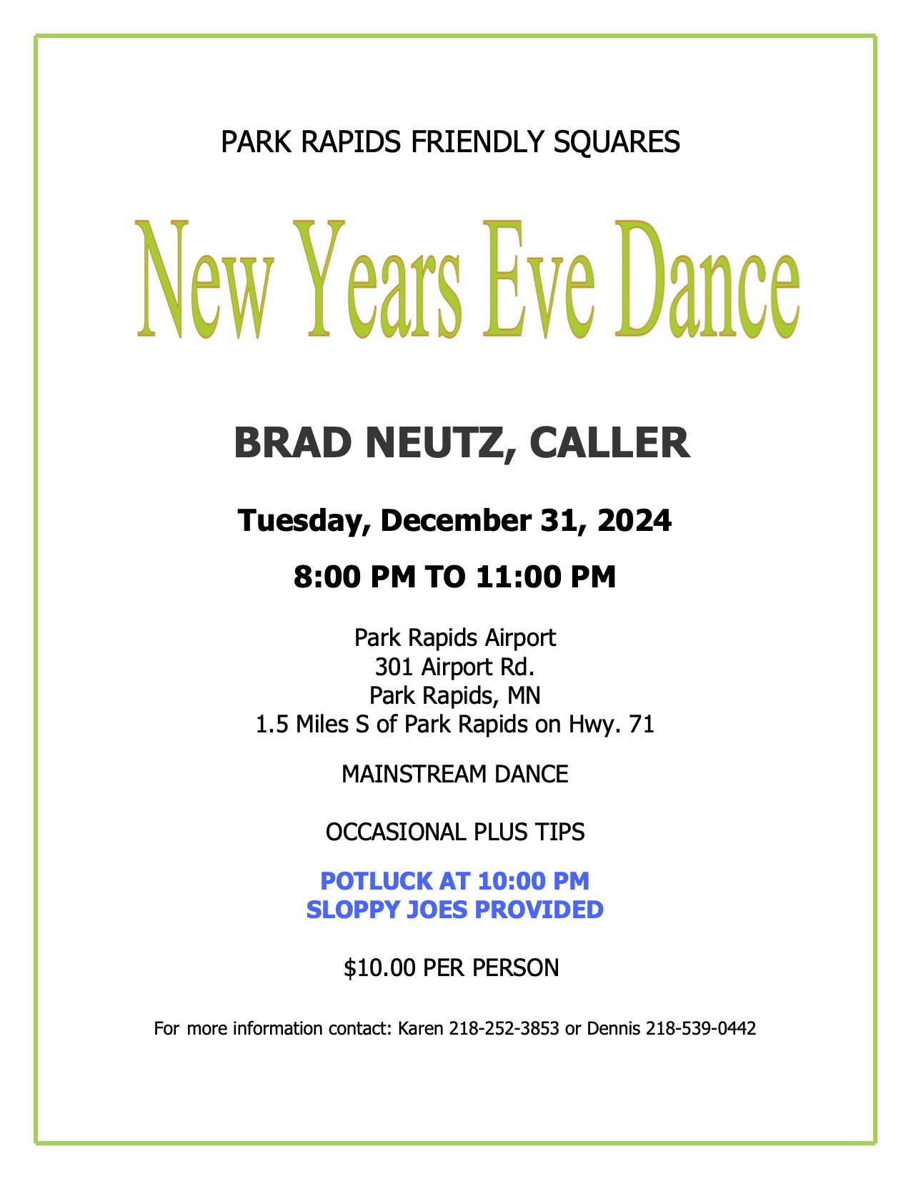 “New Years Eve” Square Dance (Caller Brad Neutz – “Mainstream” 8:00-11:00 pm). Occasional Plus Tips. Potluck at 10 pm with Sloppy Joes provided by the club. Friendly Squares Flyer