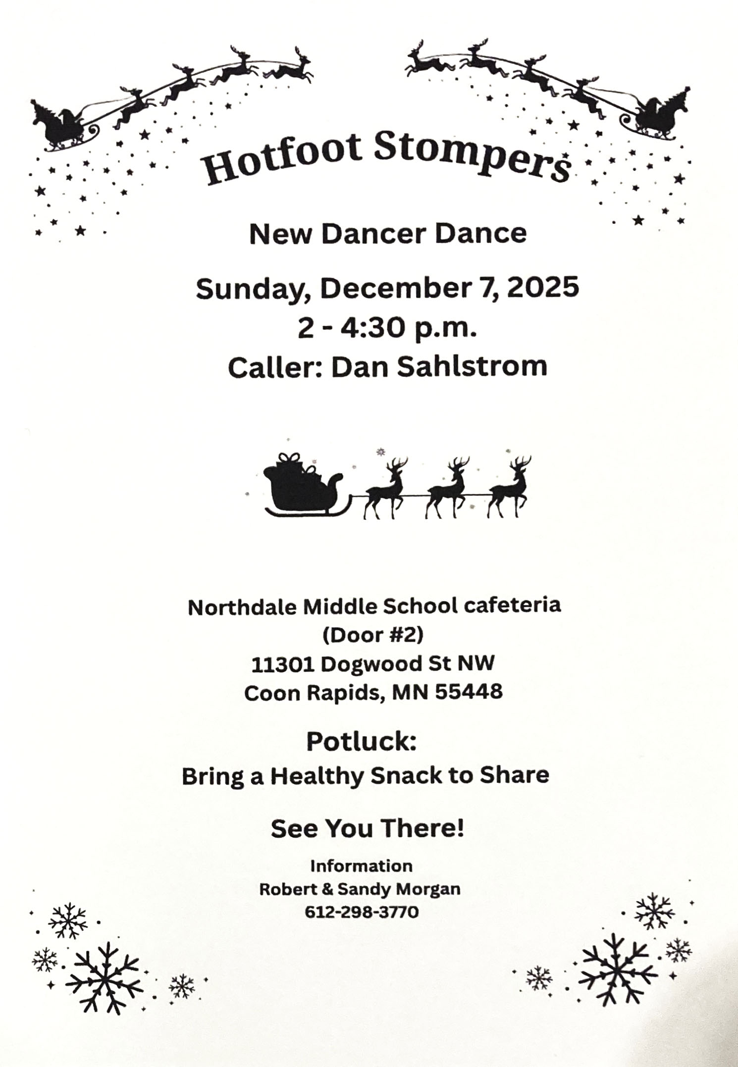 “Snowball” New-Dancer Square Dance (Caller Dan Sahlstrom – “New-Dancer Mainstream” 2:00-4:30 pm). Potluck during dance. Please bring serving utensils and/or individual separation or packaging. Hotfoot Stompers Flyer