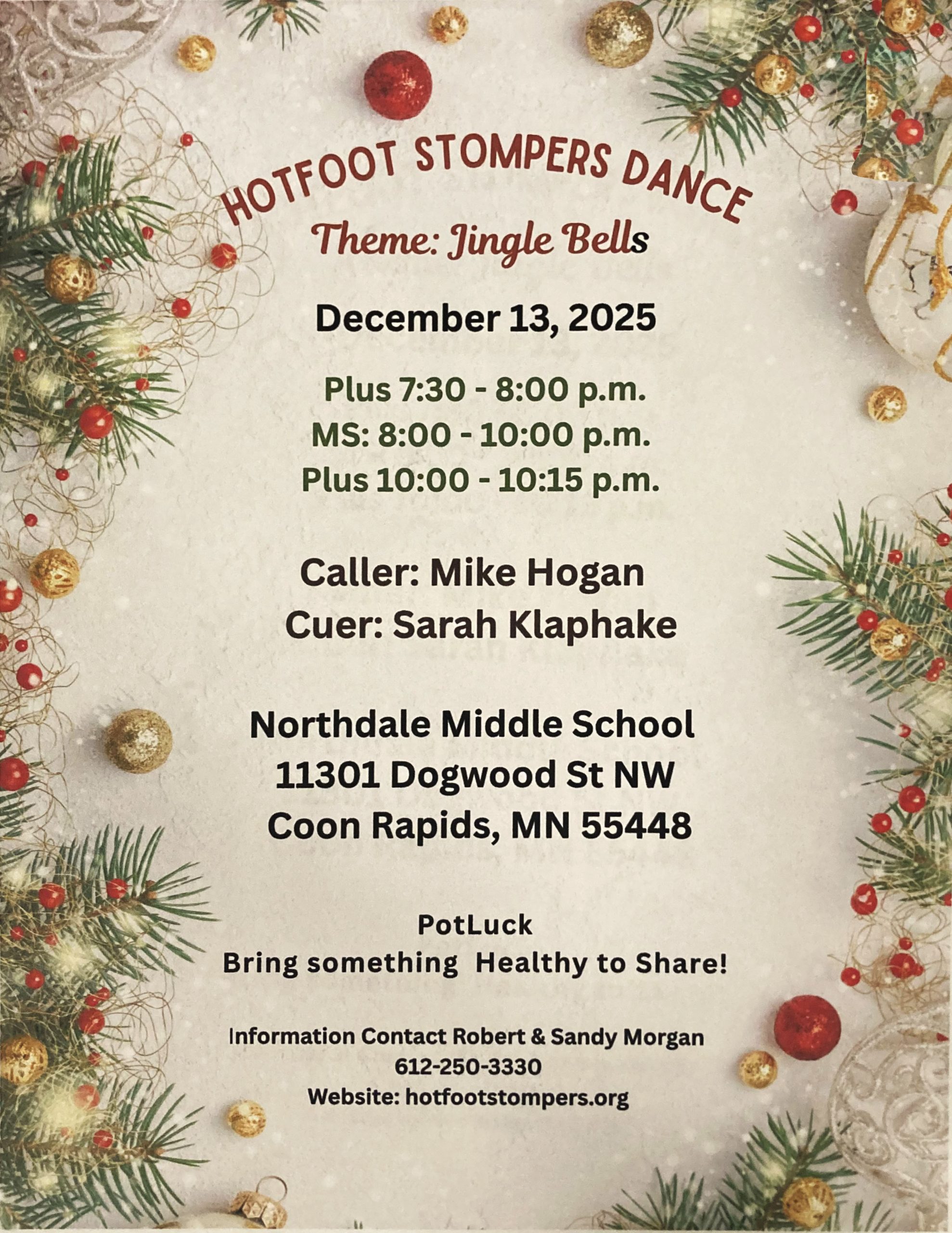 “Jingle Bells” Square Dance (Caller Mike Hogan – “Plus” 7:30-8:00 pm, “Mainstream” 8:00-10:00 pm, “Plus” 10:00-10:15; Cuer Sarah Klaphake – “Rounds” between tips). Potluck. Hotfoot Stompers Flyer