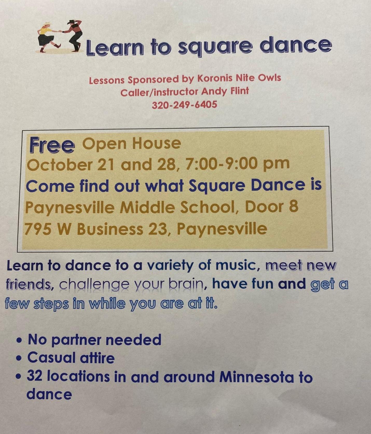 Square Dance Class (“Learn to Square Dance” 7:00-9:00 pm). Lessons starting with Free Open House October 21 and 28. Use Door 8. Koronis Nite Owls Flyer