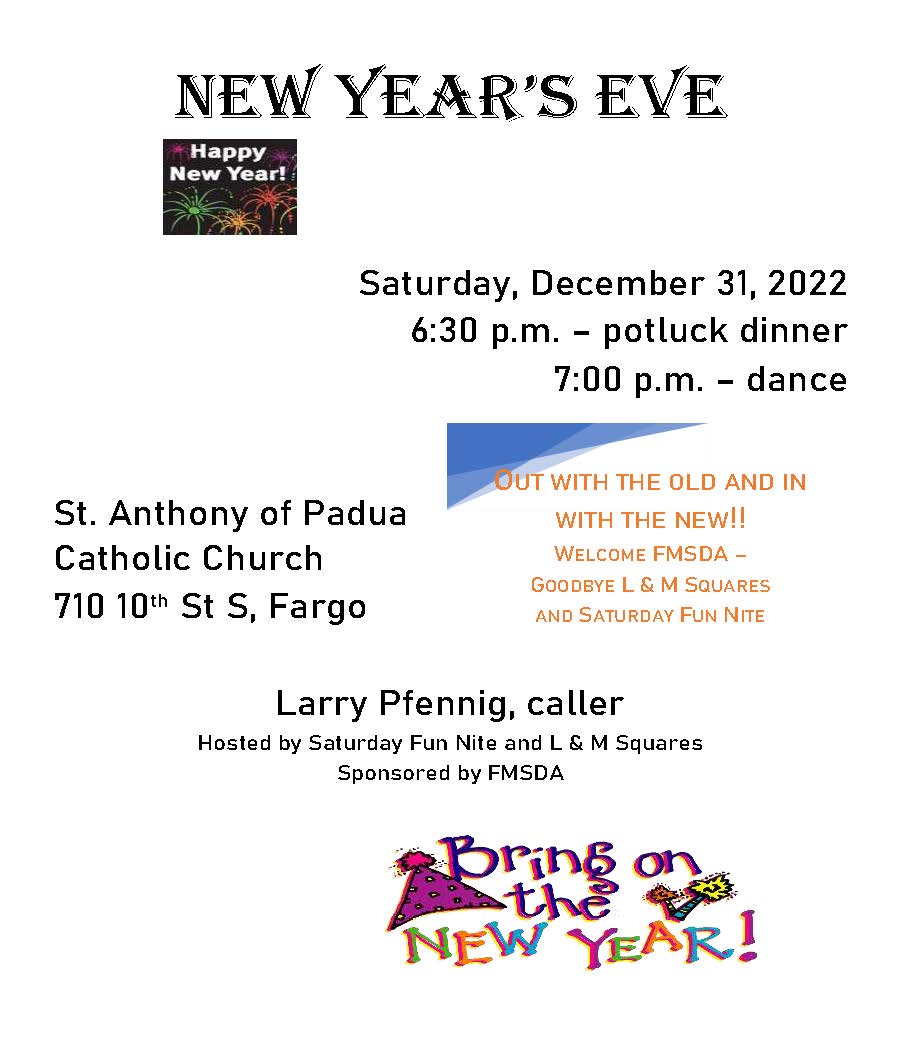 “Out with the Old – In with the New” New Year’s Eve Square Dance (Potluck dinner 6:30 pm; Caller Larry Pfennig – “Mainstream” 7:00 pm; Cuer Bernadette McNeil – “Rounds” between tips). FMSDA – L & M Squares – Saturday Fun Nite Flier