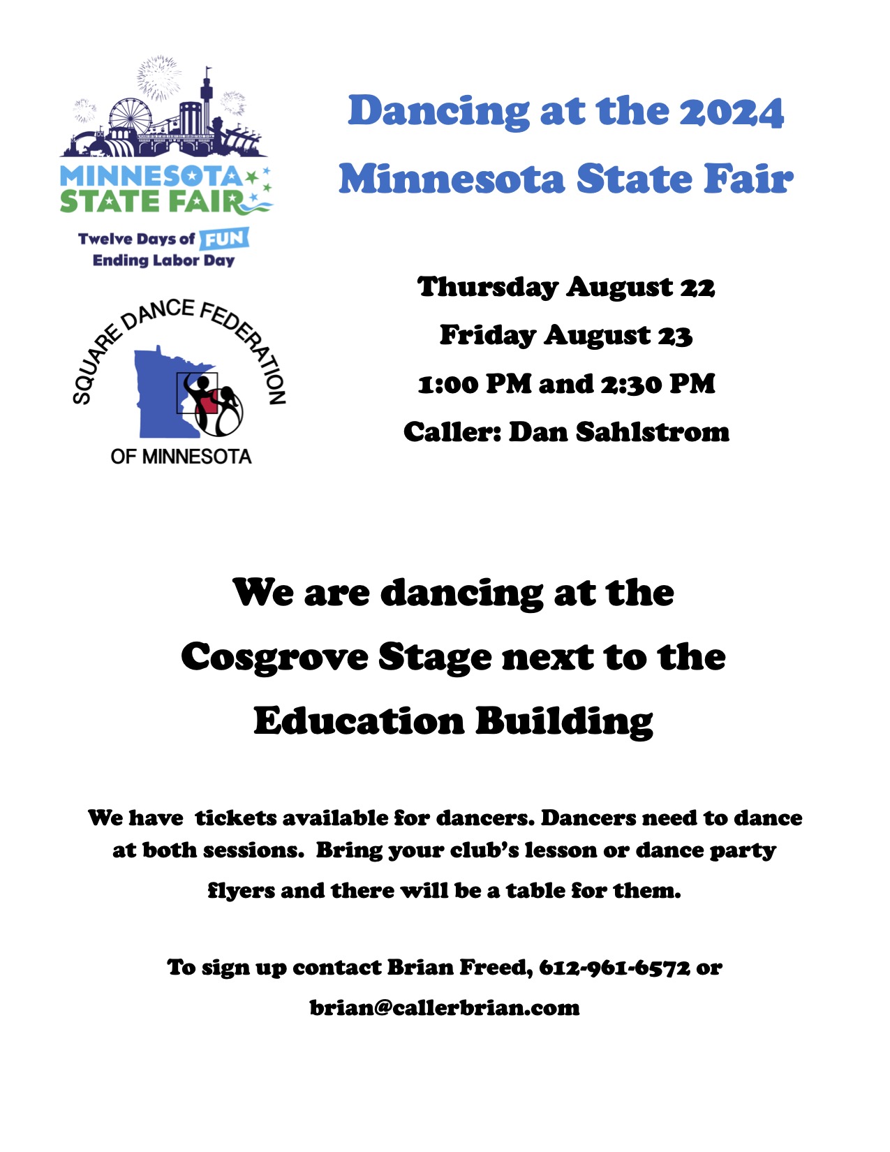 “Minnesota State Fair” Demo Square Dance (Caller Dan Sahlstrom – “Demo” 1:00 and 2:30 p.m. two sessions), dancing at the Cosgrove Stage next to the Education Building. State Fair Flyer