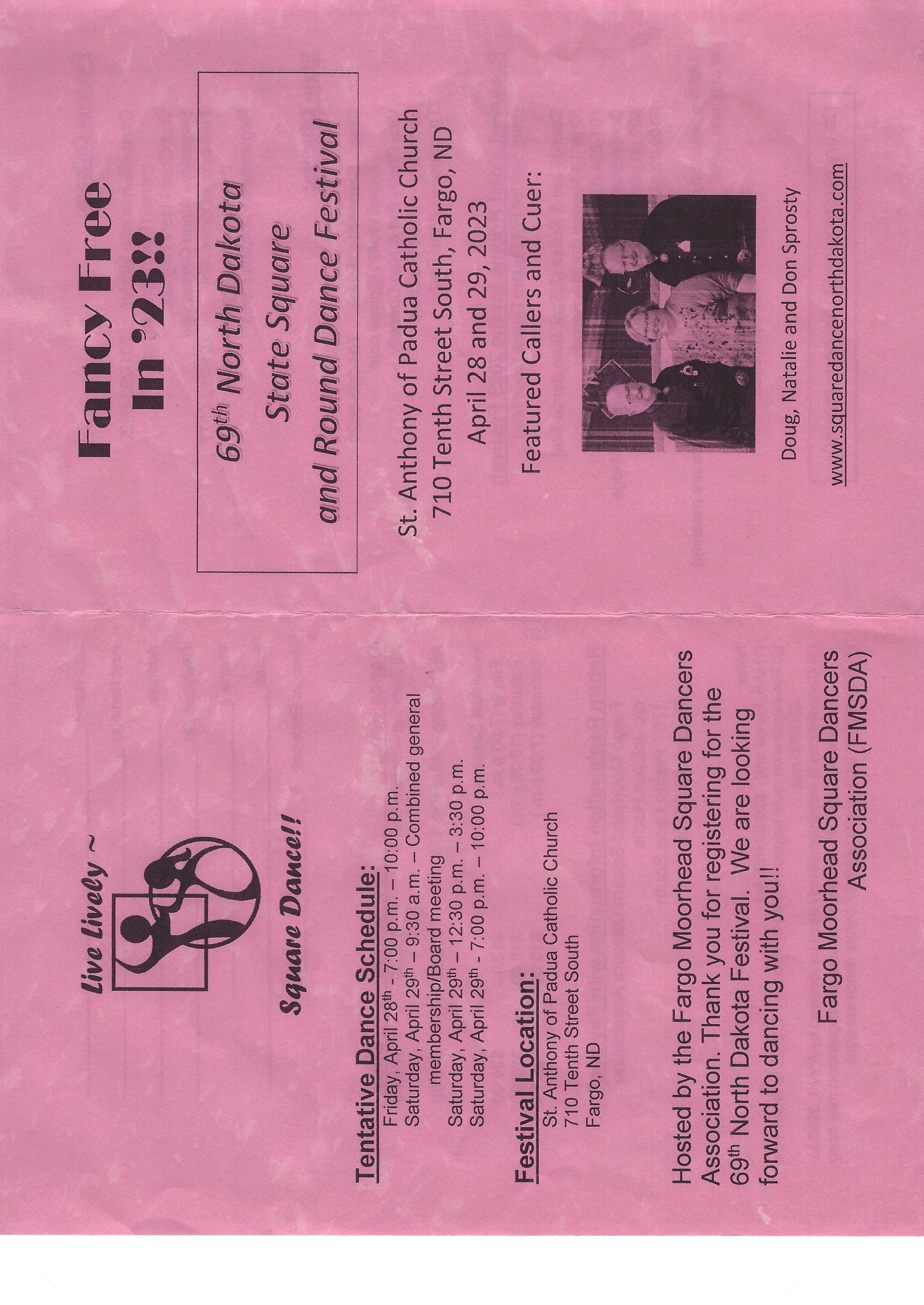 “69th” North Dakota State Square and Round Dance Festival, (Combined general membership/board meeting 9:30 am; Featured Callers Doug and Don Sprosty – 12:30-3:30 pm and 7:00-10:00 pm; Featured Cuer Natalie Sprosty “Rounds” between tips. ND Festival Flier and Registration