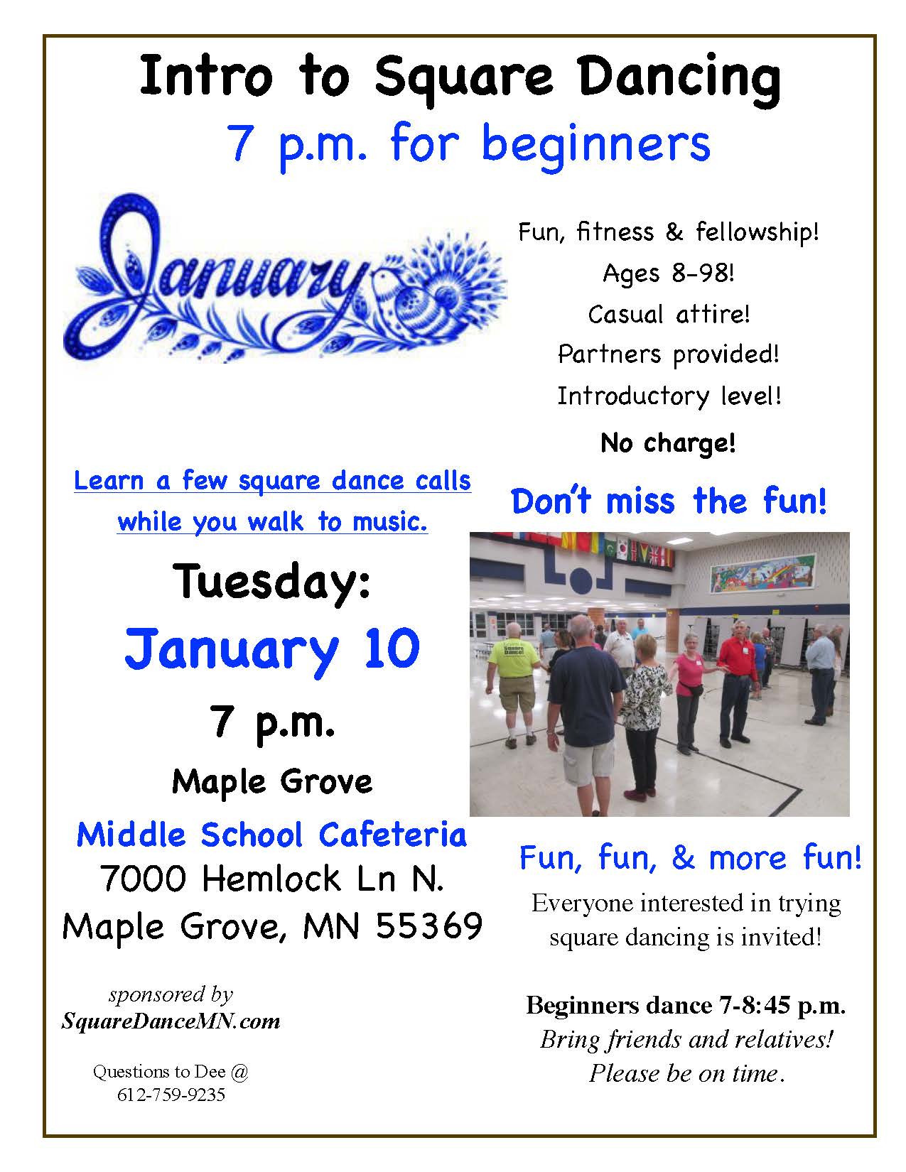 “Intro to Square Dancing” – Beginner Square Dancing 7:00-8:45 pm. casual attire, free, everyone interested in trying square dance is invited. North Metro Flier