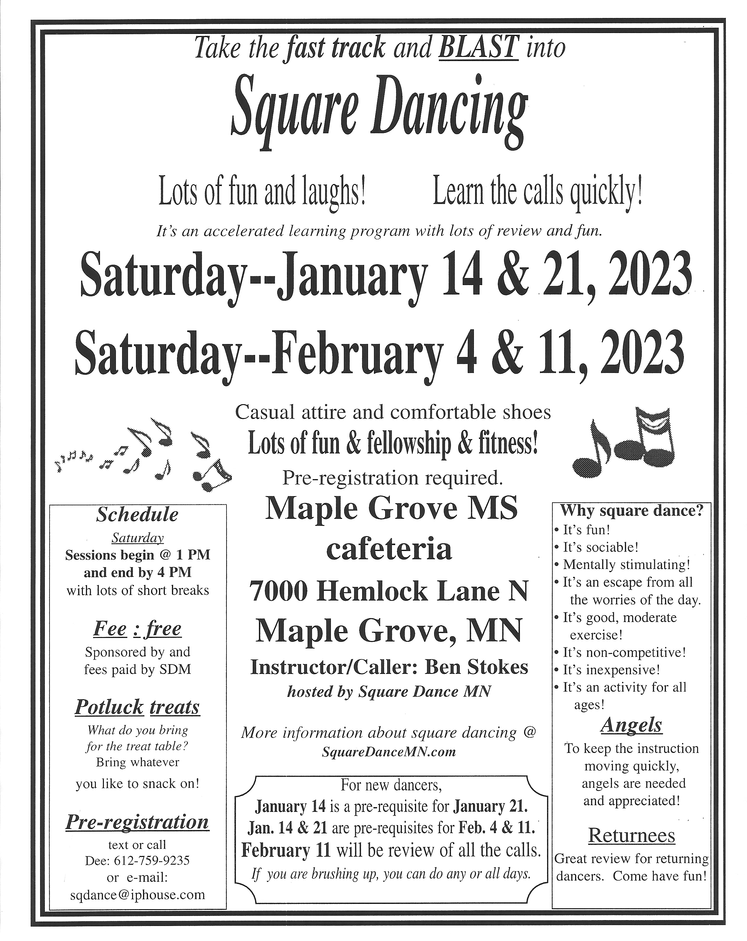 North Metro Mainstream Blast (Caller Ben Stokes – “Mainstream” instruction will include all calls 1:00-4:00 pm); January 14 and 21 and February 4 sessions are a prerequisite for new dancers at the following sessions; potluck treat table. North Metro Blast Flier