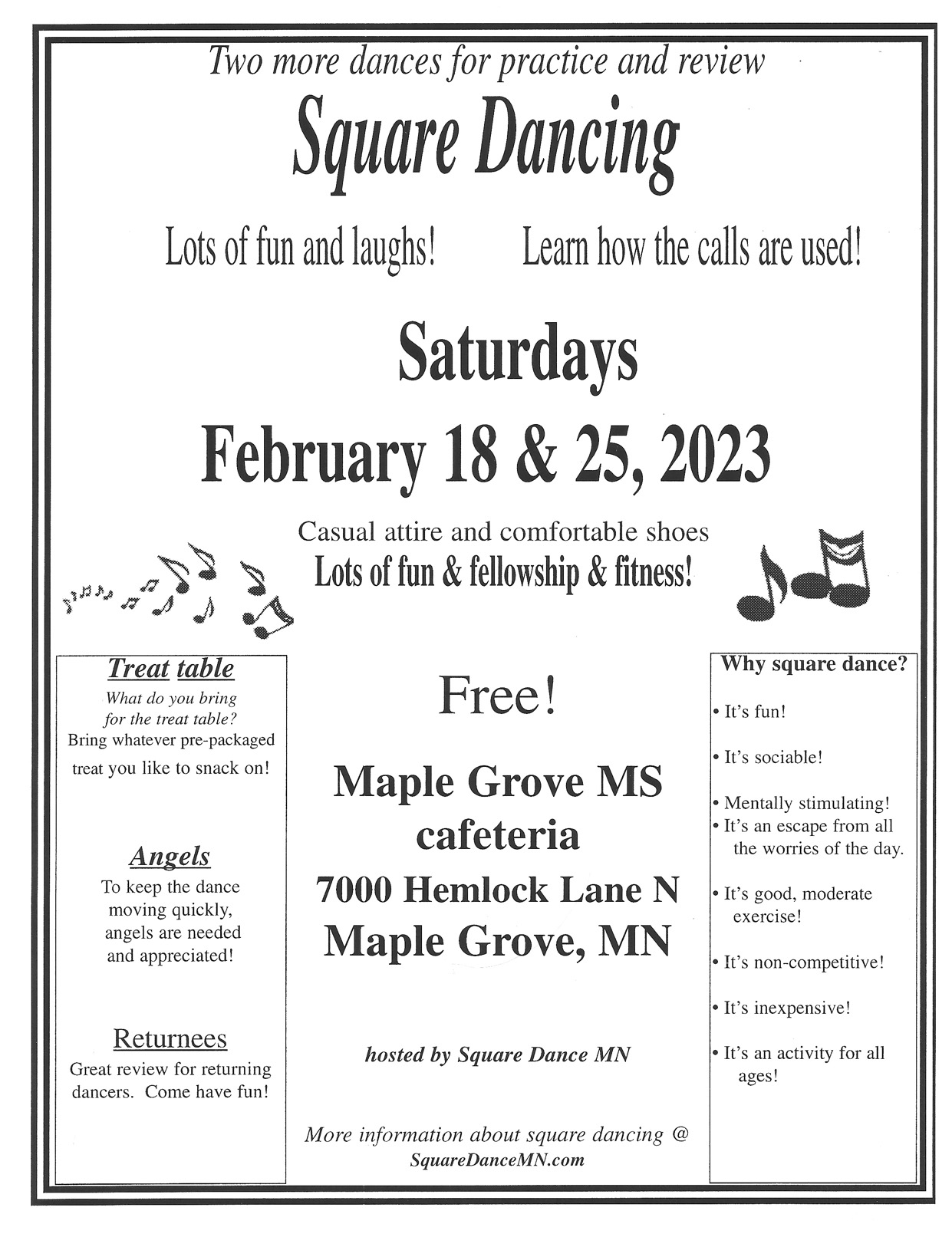 North Metro New Dancer (“Mainstream Review” for new graduates and brush-up for current dancers 1:00-4:00 pm); February 18 and 25; potluck treat table. (Caller Larry Fruetel Feb 18) North Metro New Dancer Review Flier
