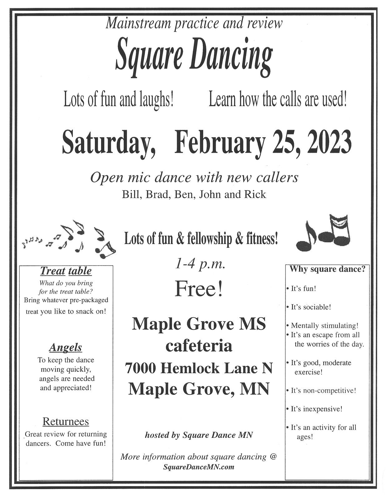 North Metro New Dancer (“Mainstream Review” for new graduates and brush-up for current dancers 1:00-4:00 pm); February 25; potluck treat table.  North Metro New Dancer Review Flier
