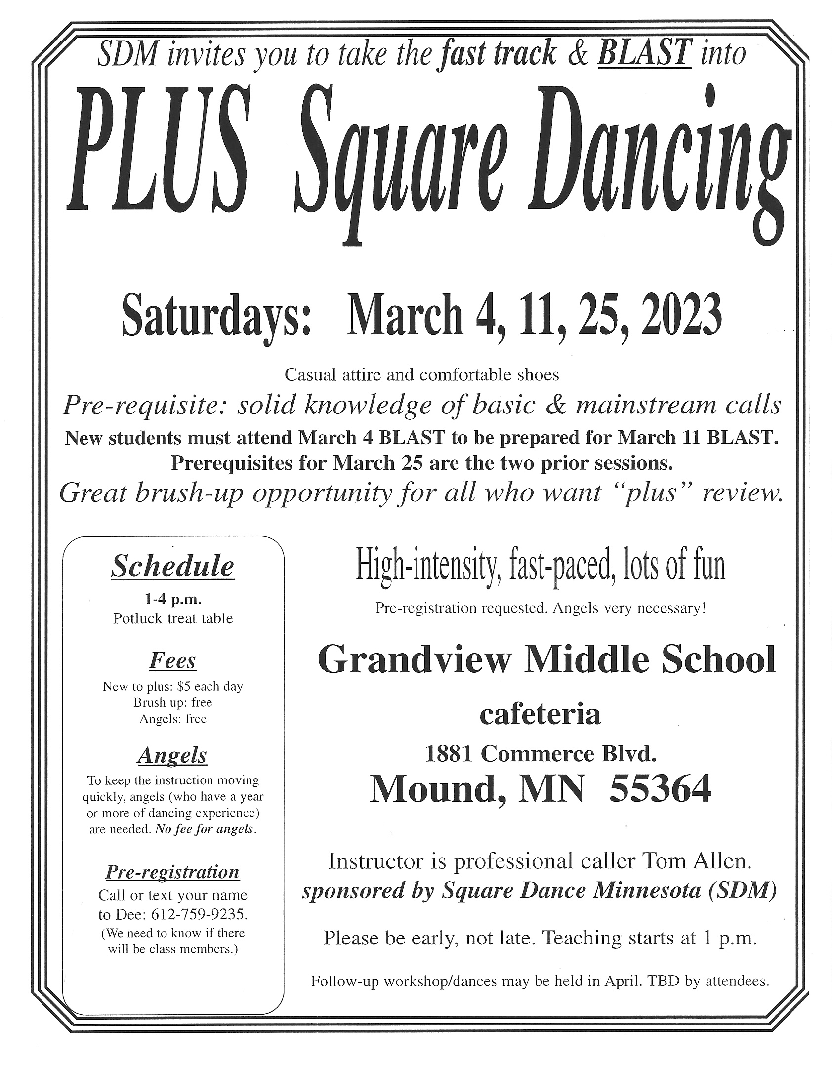 West Metro Plus Blast (Caller Tom Allen – “Plus” Instruction will include 15 calls, 1:00-4:00 pm; potluck treat table. New student pre-requisites: solid knowledge of basic and mainstream calls; must attend the March 4 Blast to be prepared for the March 11 Blast; and must attend both prior March sessions for the March 25 Blast. Potluck treat table. West Metro Plus Blast Flier