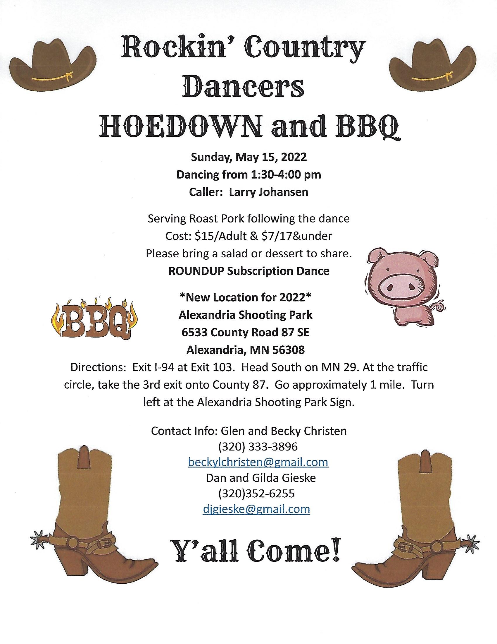“Hoedown and BBQ” Square Dance (Caller Larry Johansen – “Mainstream” 1:30-4:00 pm), potluck.  Rockin’ Country Dancers Flier