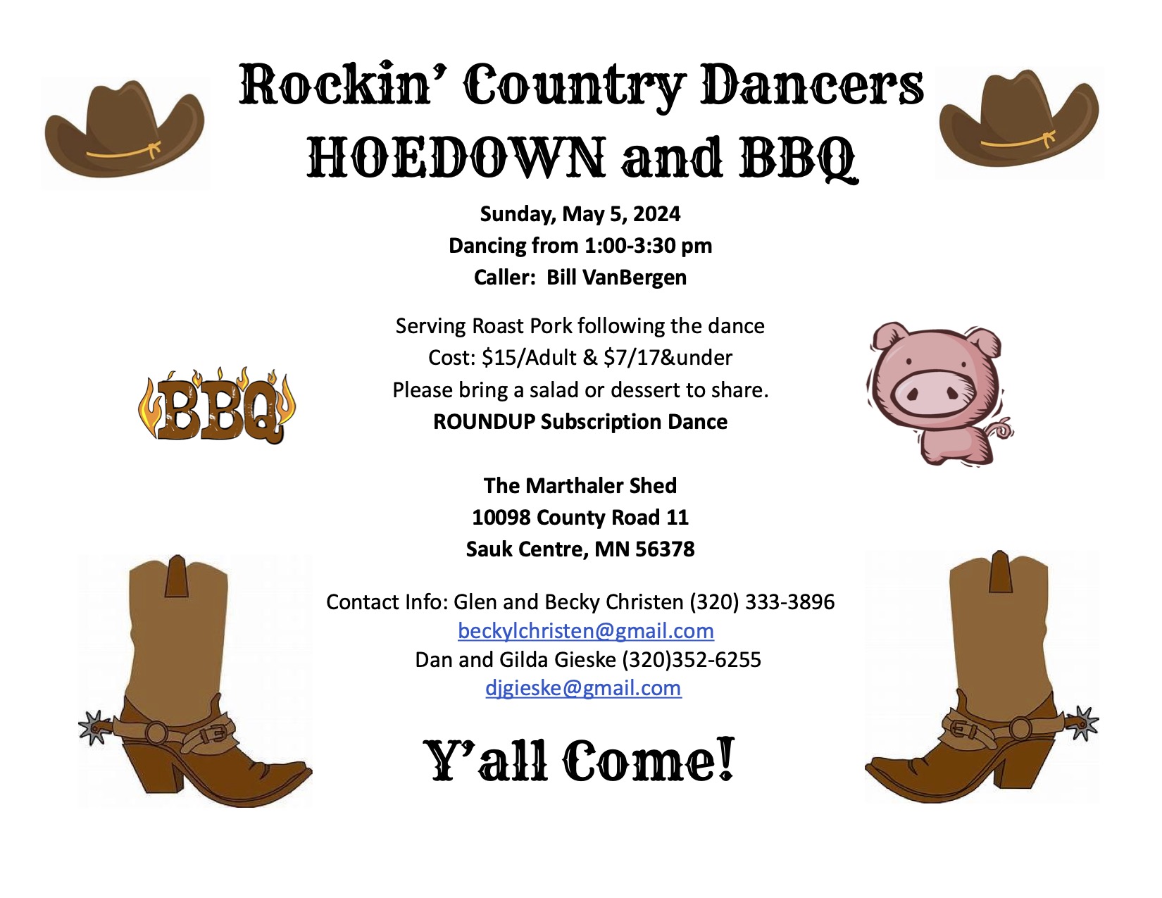 “Hoedown and BBQ” Square Dance (Caller Bill VanBergen – “Mainstream” 1:00-3:30 pm), potluck. Rockin’ Country Dancers Flyer