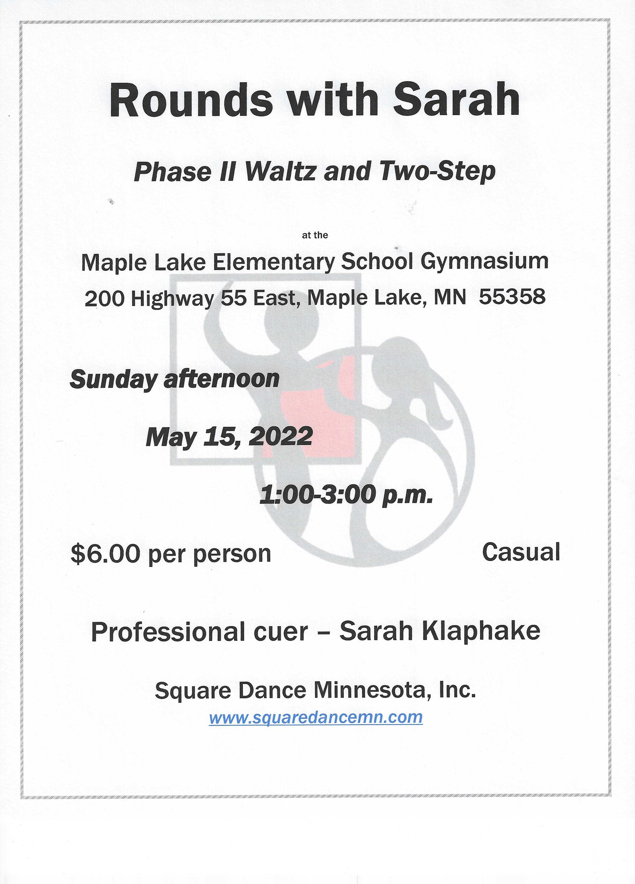 Round Dance (Cuer Sarah Klaphake – “Phase II Waltz and Two-Step,” 1:00-3:00 pm), potluck snack table during dance, casual. Rounds with Sarah Flier